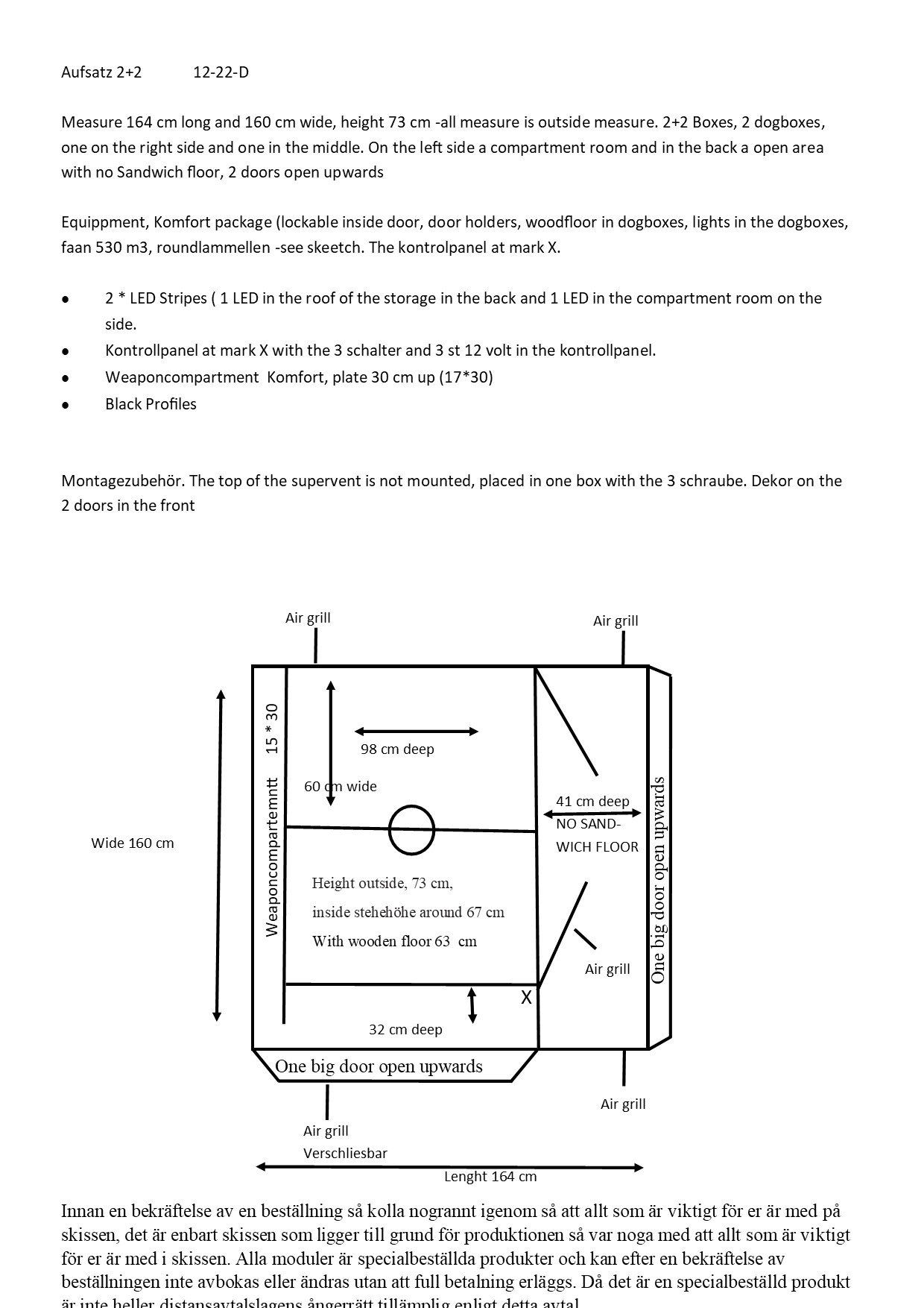 Vi bygger som du vill! Men 73 cm är en bra höjd för de flesta jakthundar samtidigt som det inte ger stort vindfång. Gör man boxen högre än 73 cm kan man få vinden fel genom ett kallras. Detta då vinden går ner via superventilen. Detta löser man enkelt genom en spoiler på taket som leder bort luften. Av flera tusen sålda moduler med högre mått har 3 kunder haft detta problemet. Men bara så att man tänker på det hela.