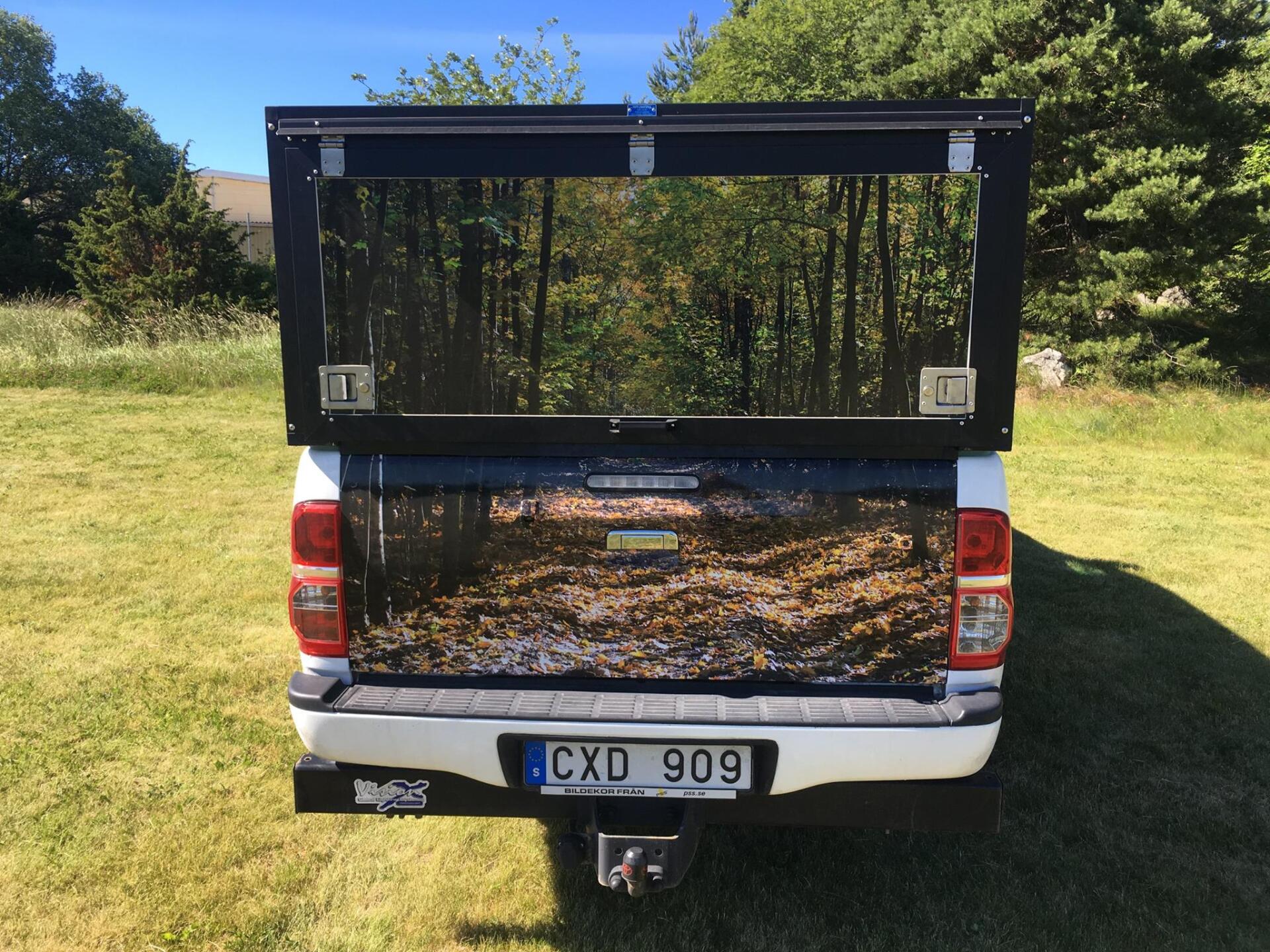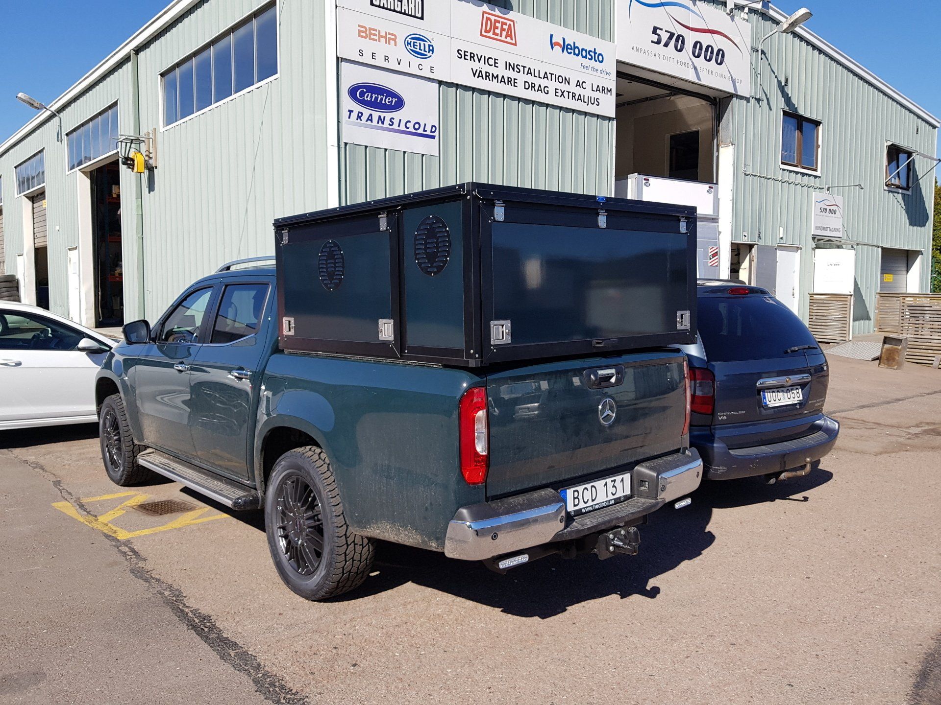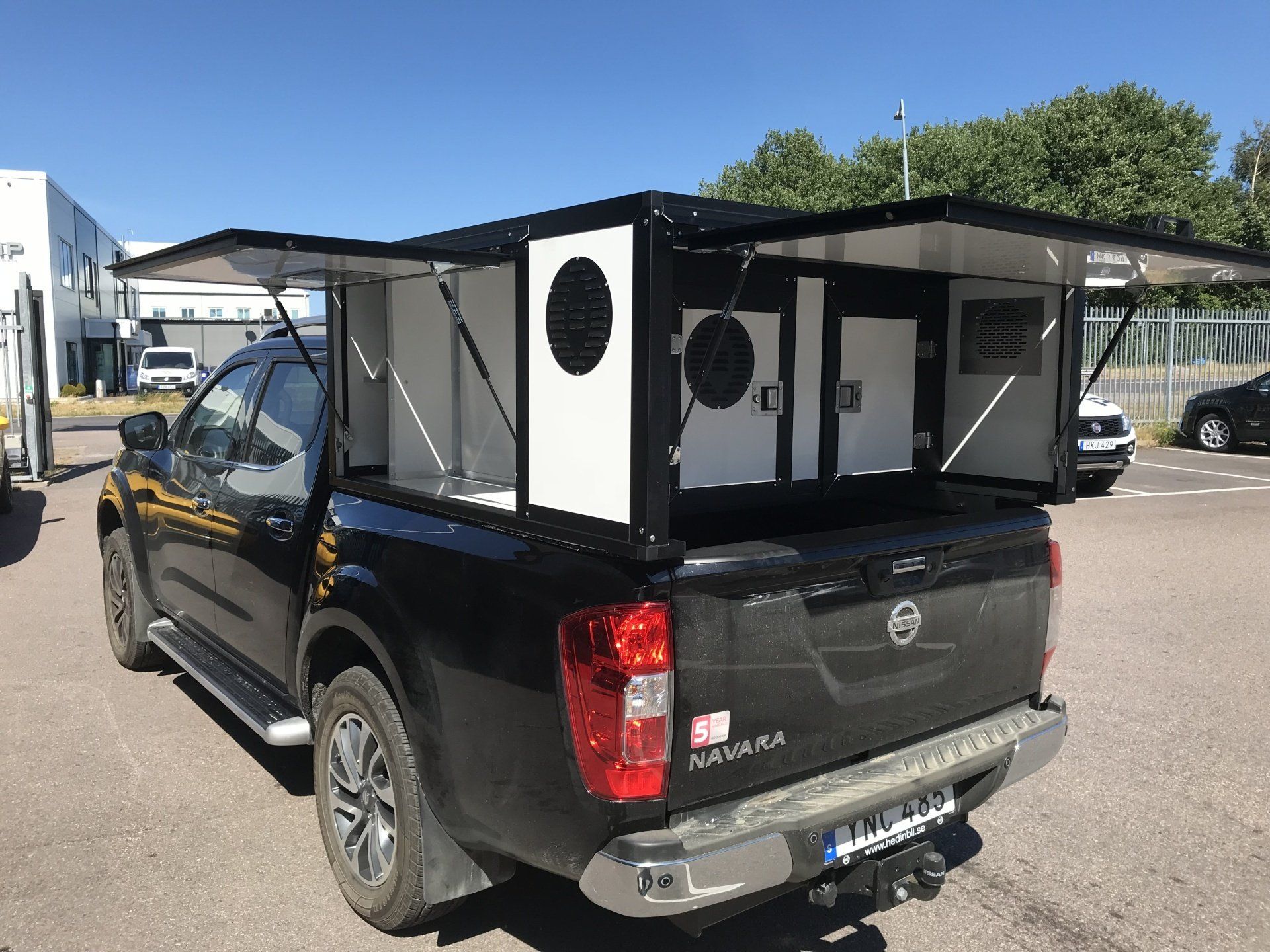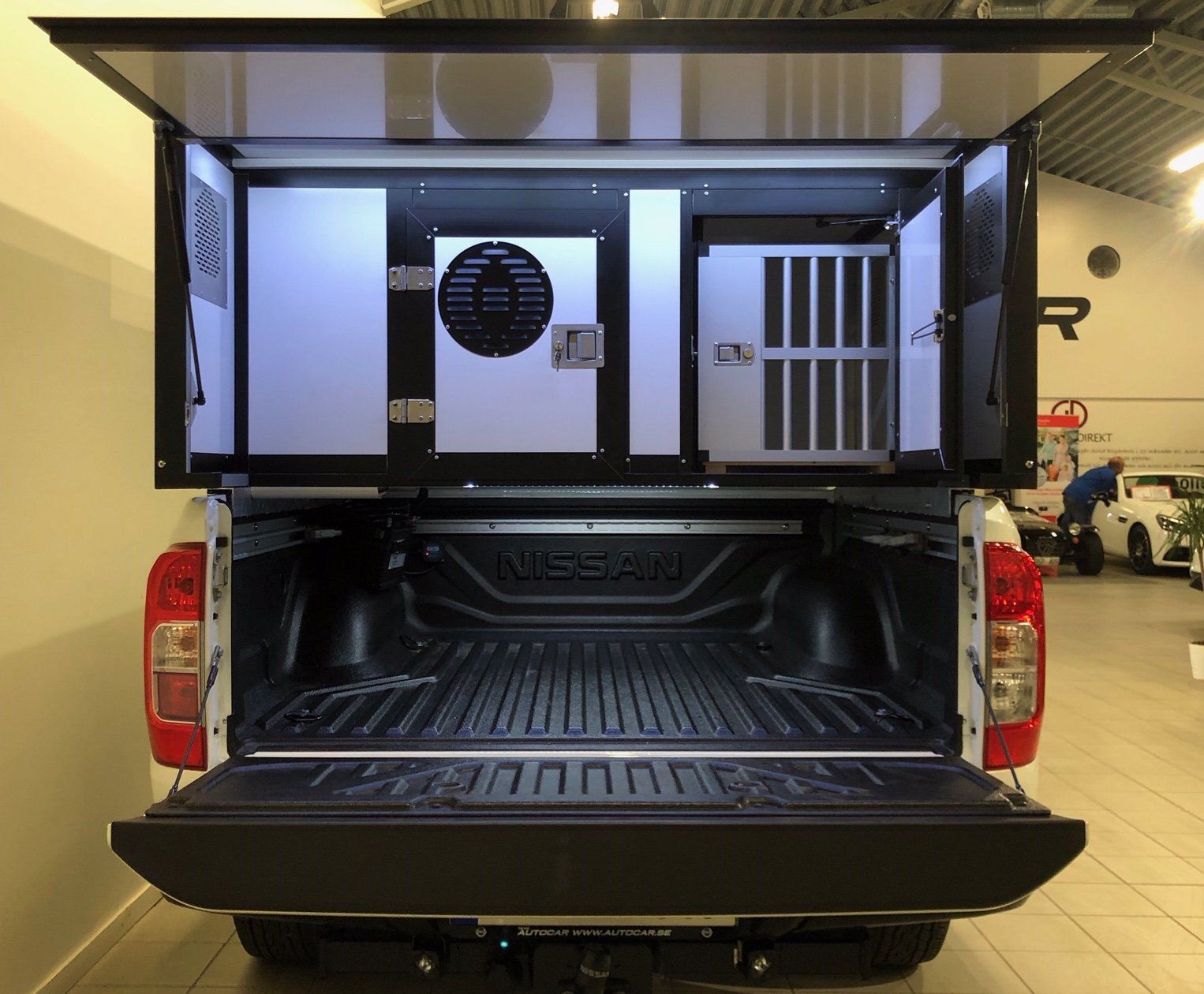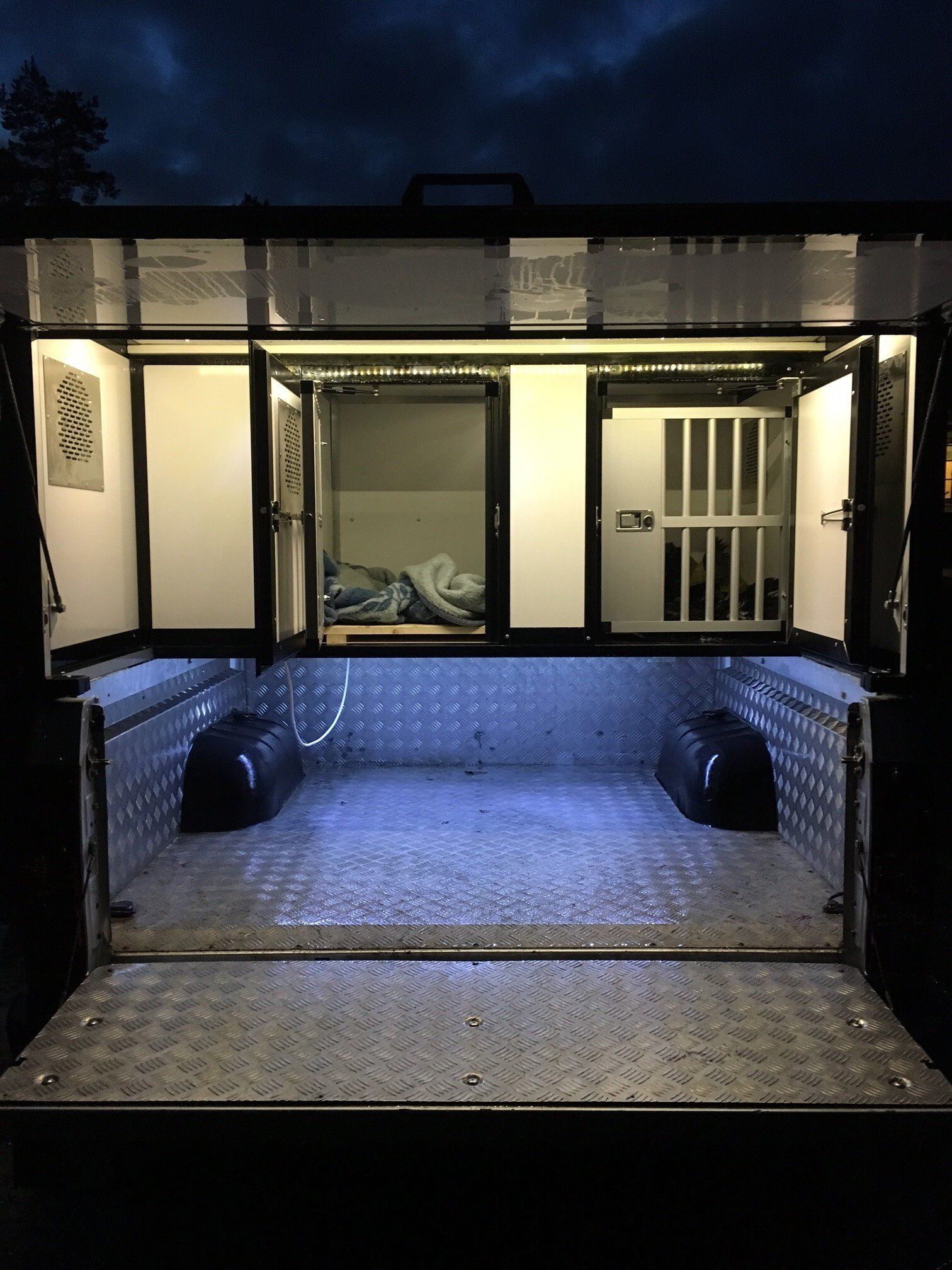 För att få bästa stabilitet över tid har vi alltid parallell balken från höger till vänster sida i en rak linje. Därmed får det väldigt kraftigt och stabilt så balkarna ger varandra stabilitet. Hundboxarna blir därmed lika djupa som packfacket blir brett. Inne i själva kåpan får man sedan självklart isolerade ytterdörrar med innergrind bakom för bästa klimat!
