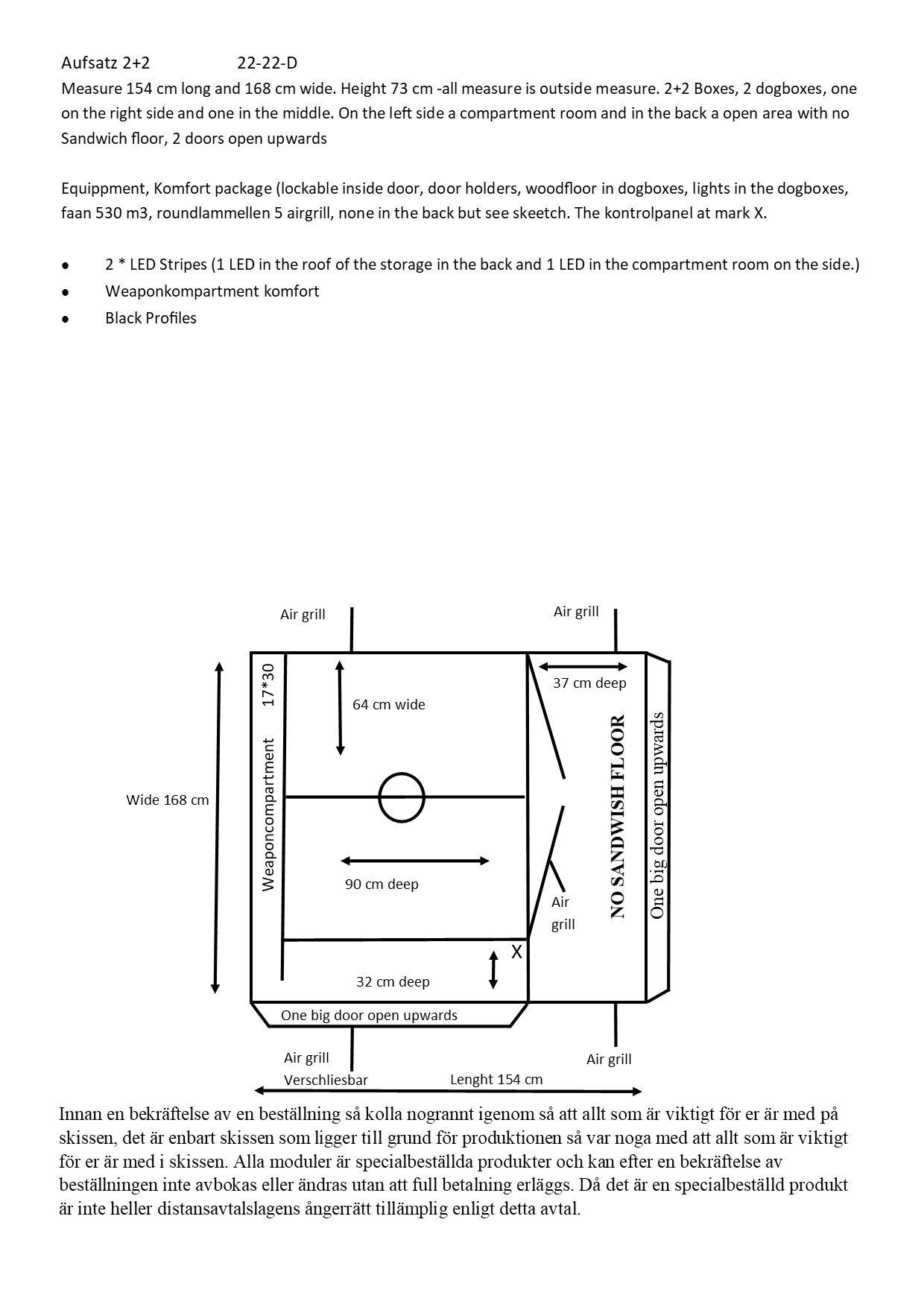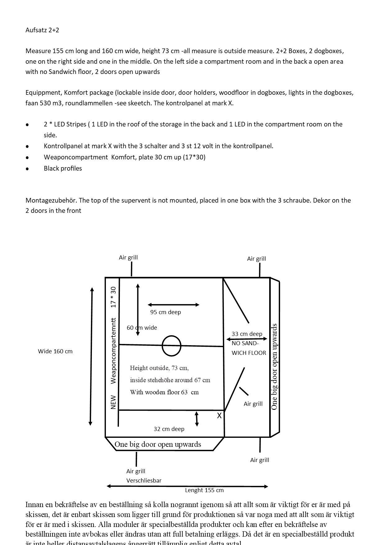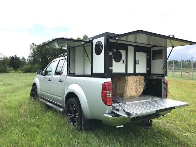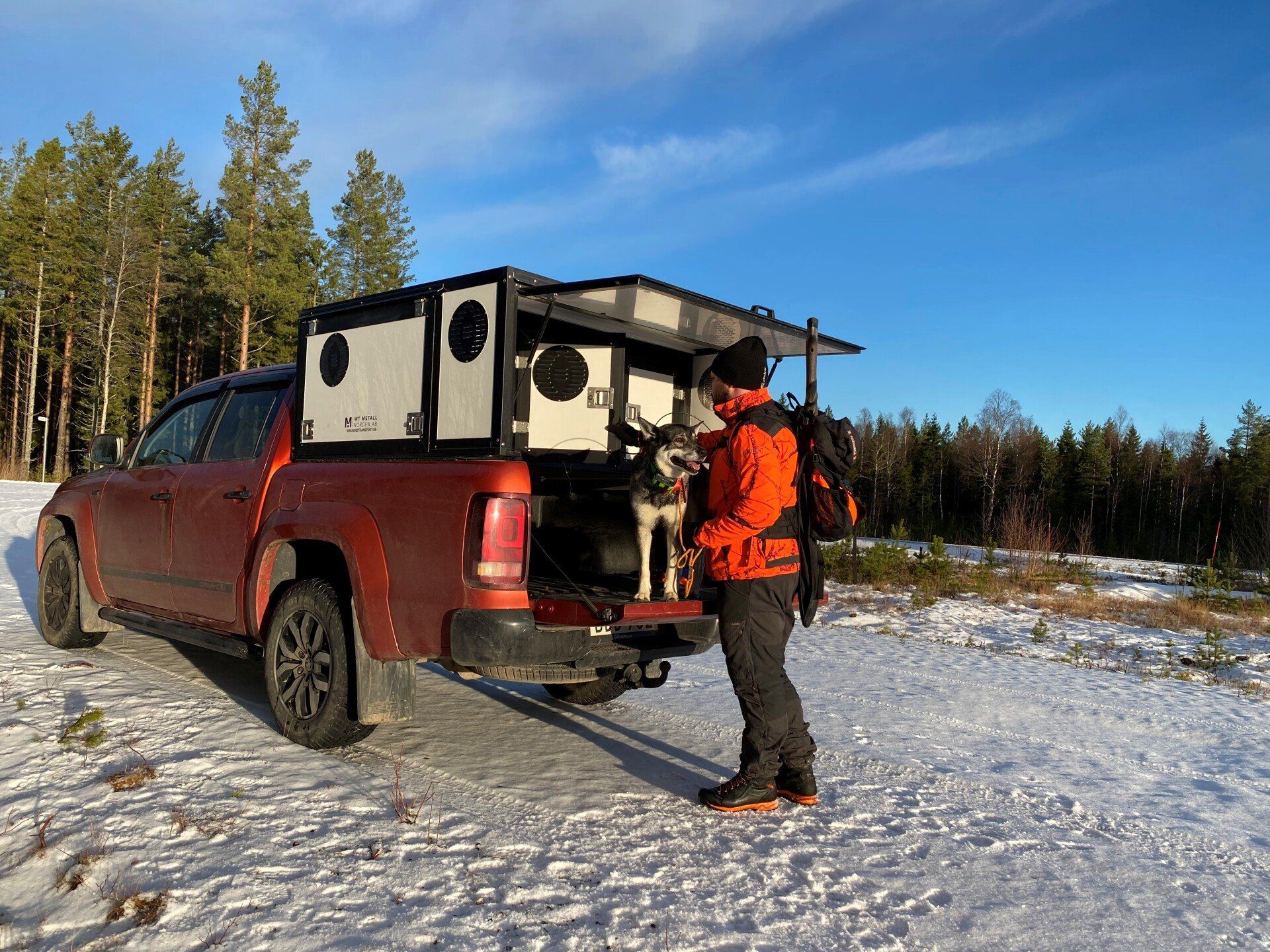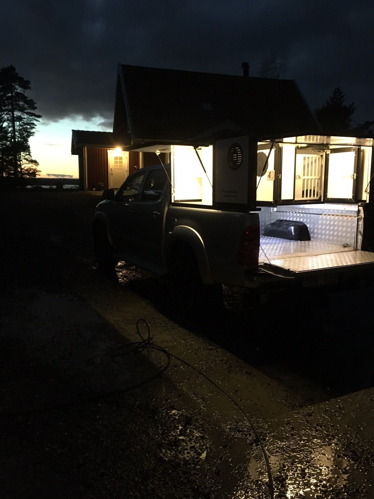 För många av våra kunder är det viktigt att kunna kombinera arbete med jakt och för att kunna tillfredställa detta på bästa möjliga sätt har vi en modul som heter 2+2. Detta är en vidareutveckling på modul 2+1 där man har 2 hundboxar i fram samt helt öppet i bak med frihöjd.
