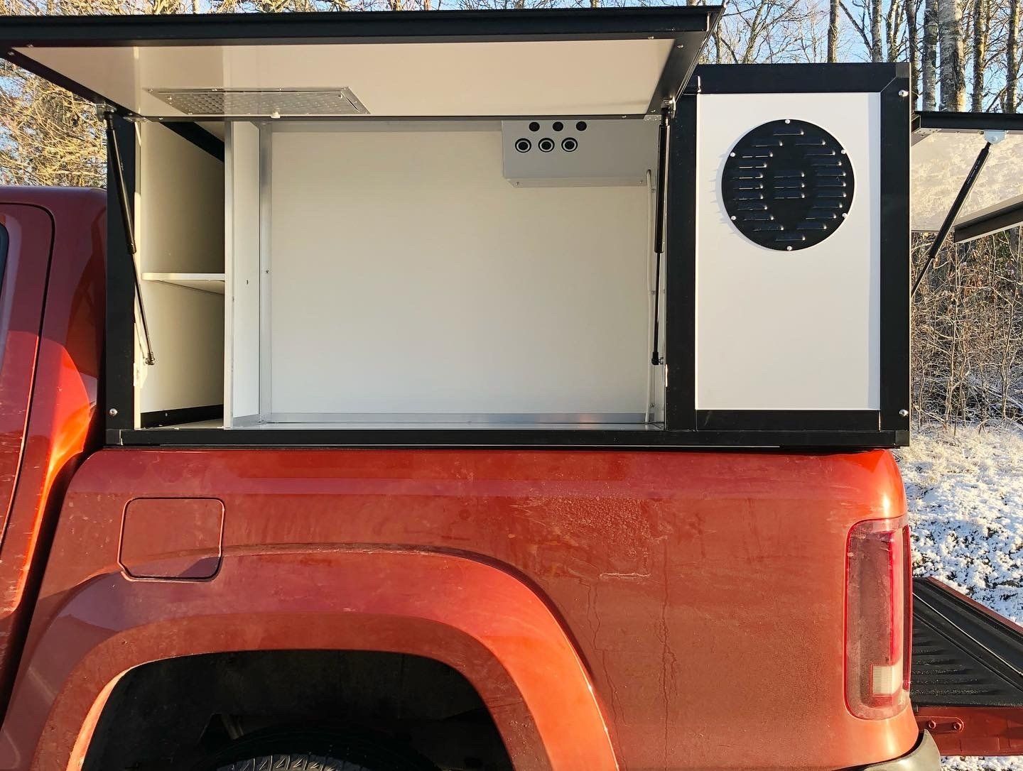 Alla våra hundboxar är utrustade med en kraftig elektrisk fläkt på taket med inbyggd LED belysning för boxarna. Fläkten sitter skyddat ovanpå taket i en superventil så att inget sticker ner som kan skada era hundar. Luftintagen sitter högt placerade för bästa klimat för era hundar. Våra förstärka innergrindar är stabila och sitter hårt på plats, de är lätta att justera över tid. Grindarna är självklart låsbara med nyckel likt våra isolerade ytterdörrar. Det är samma nyckel till modulen men olika nyckelserier så att man inte kommer in med annan nyckel. Vi har även isolerade ytterdörrar till hundboxarna i vårt 2+2 så att man inte får kallras in i boxarna från flaket. En väldigt viktig detalj! Nedtill har vi självklart ingen kant utan lätt att rengöra!