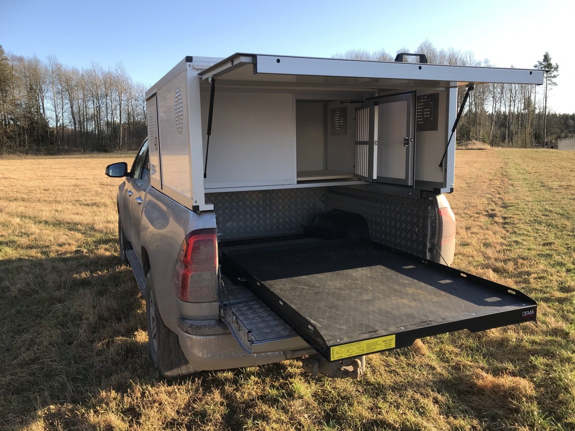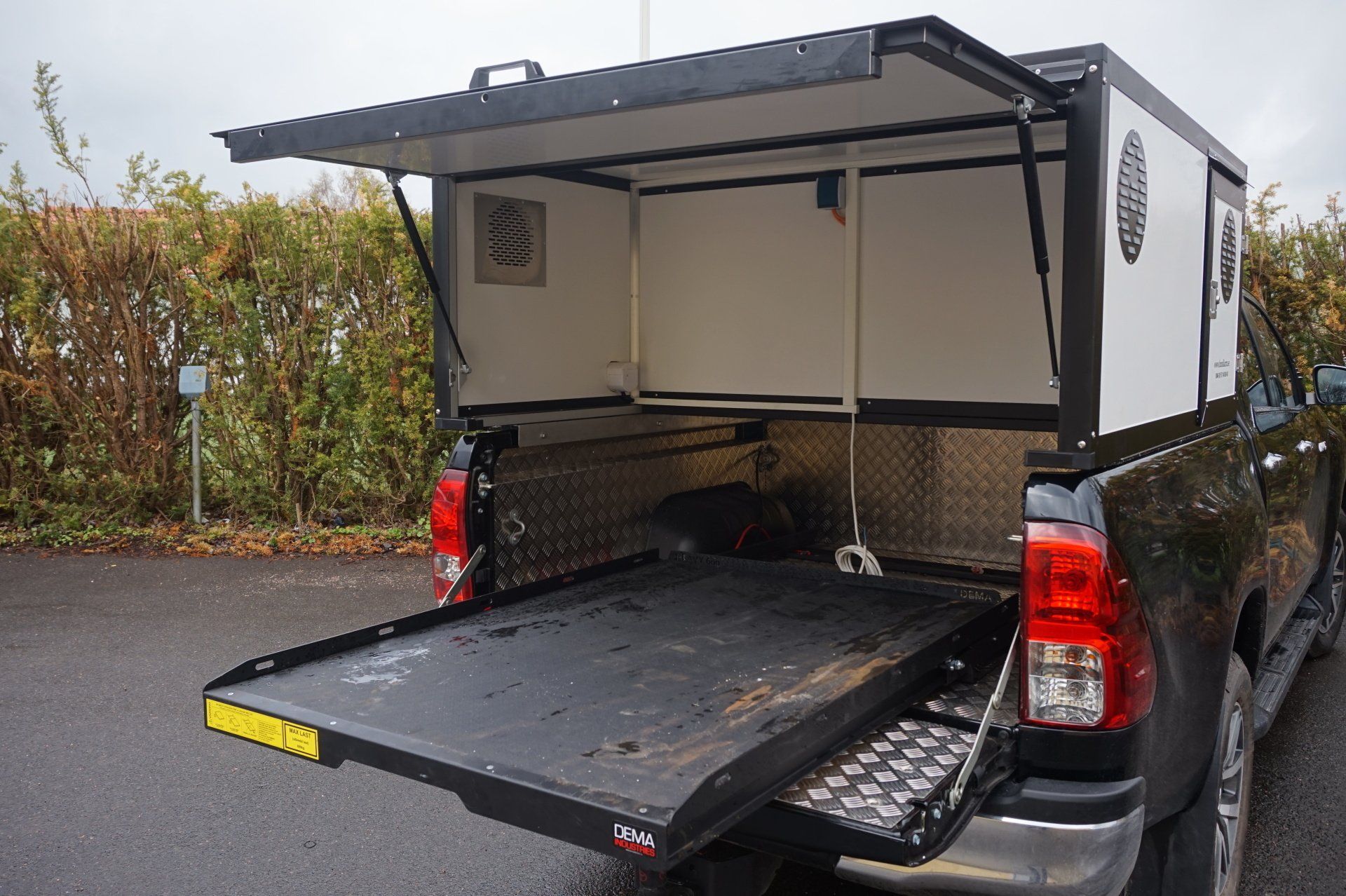 - Lastsläde under gör att man på ett enkelt sätt kommer åt sakerna längt in på flaket, går att dra ut till 70 % av sin längd.