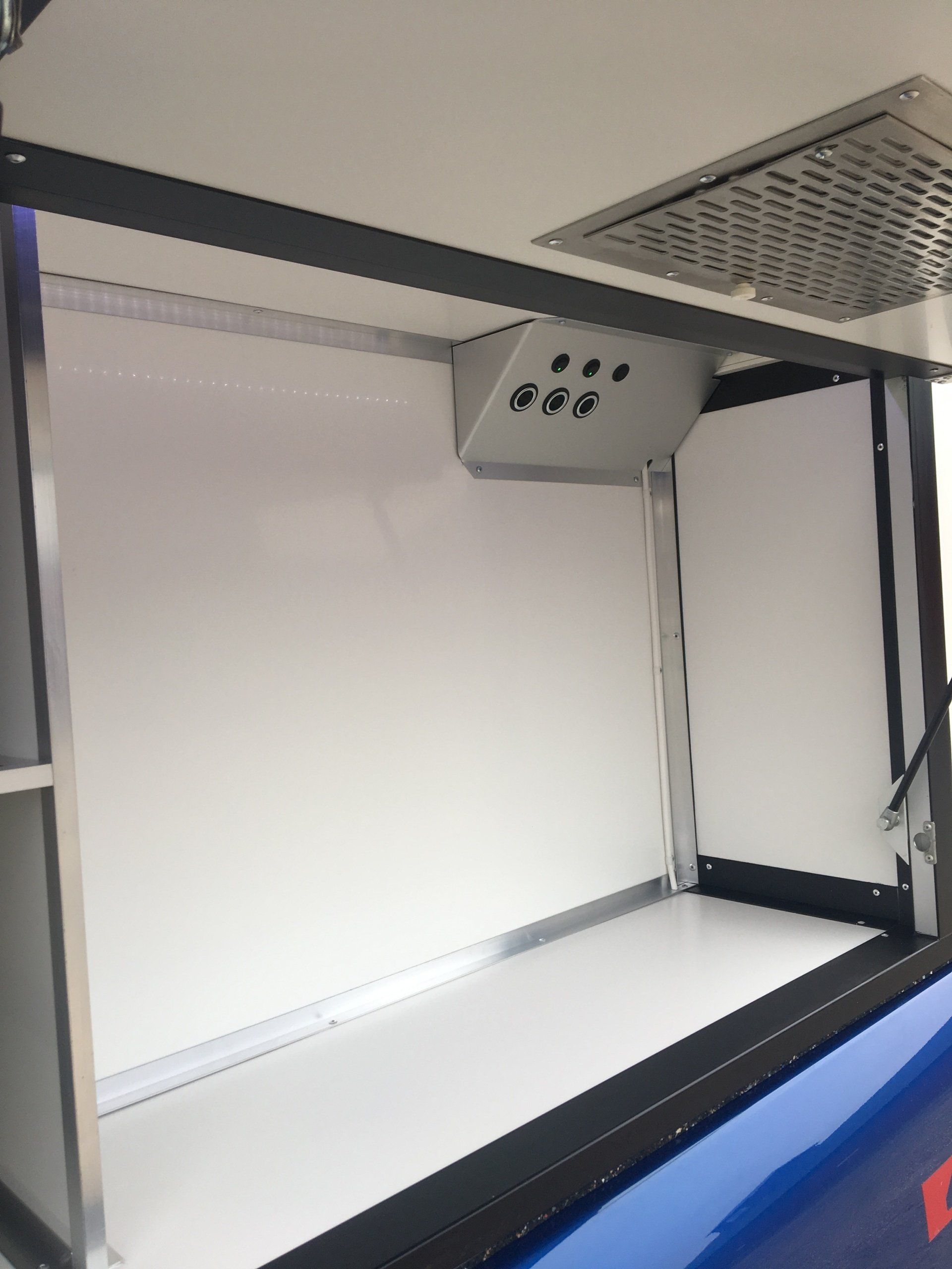I boxarna har vi i grundpriset gummimattor (bygger ca 1 cm) och som tillval finns trätrall (bygger ca 4 cm). Alla ytterdörrar har gasdämpare så att de hålls på plats och för hundarna har vi även dörruppställare så att man kan få ett bra självdrag utan att få in solljuset när man står parkerad. Våra luftintag sitter på sidan för att slippa baksuget från bilen vid färd på dammiga grusvägar.