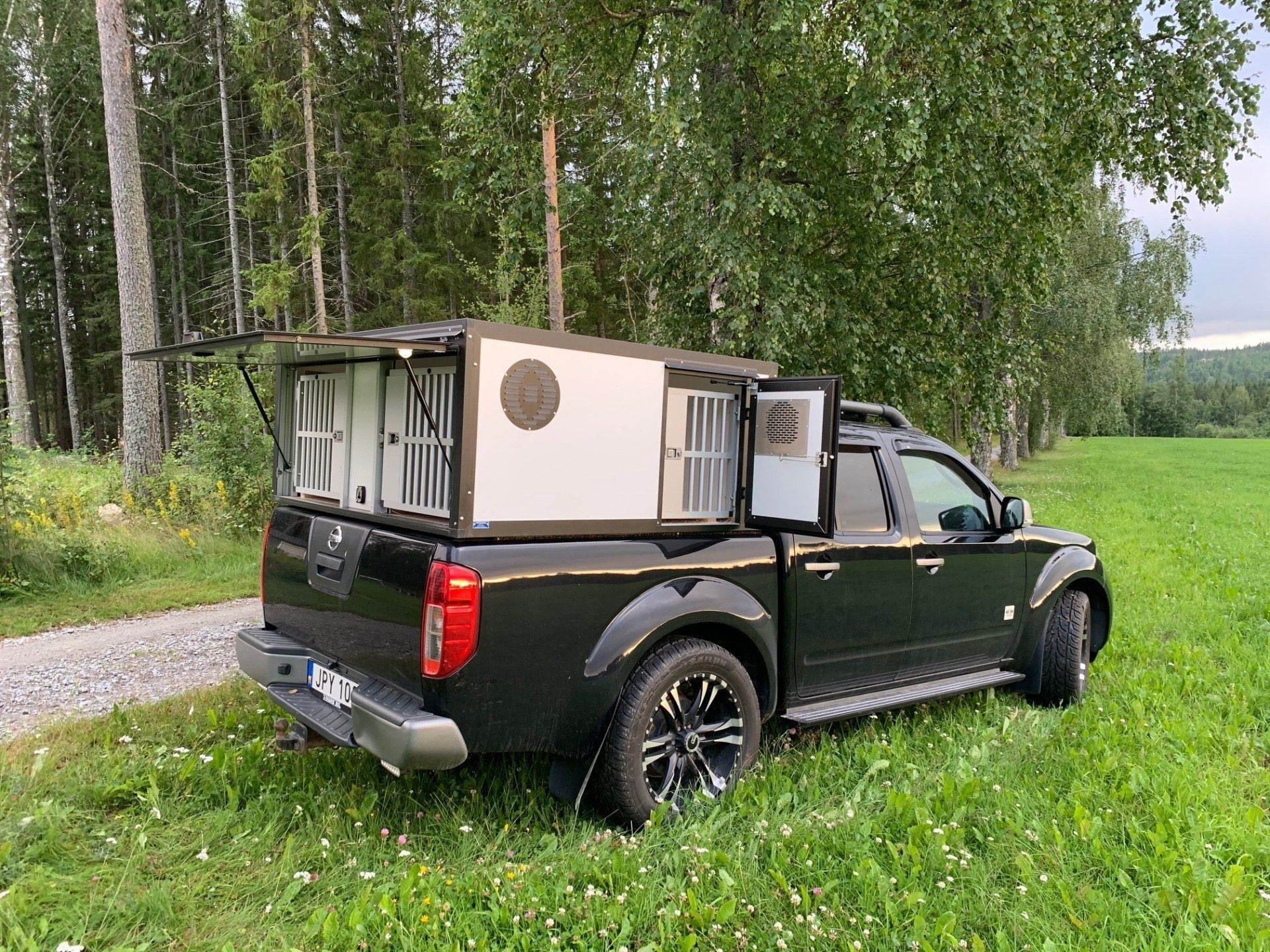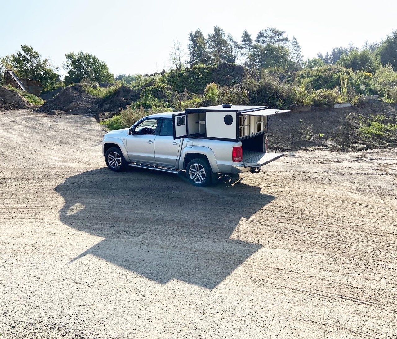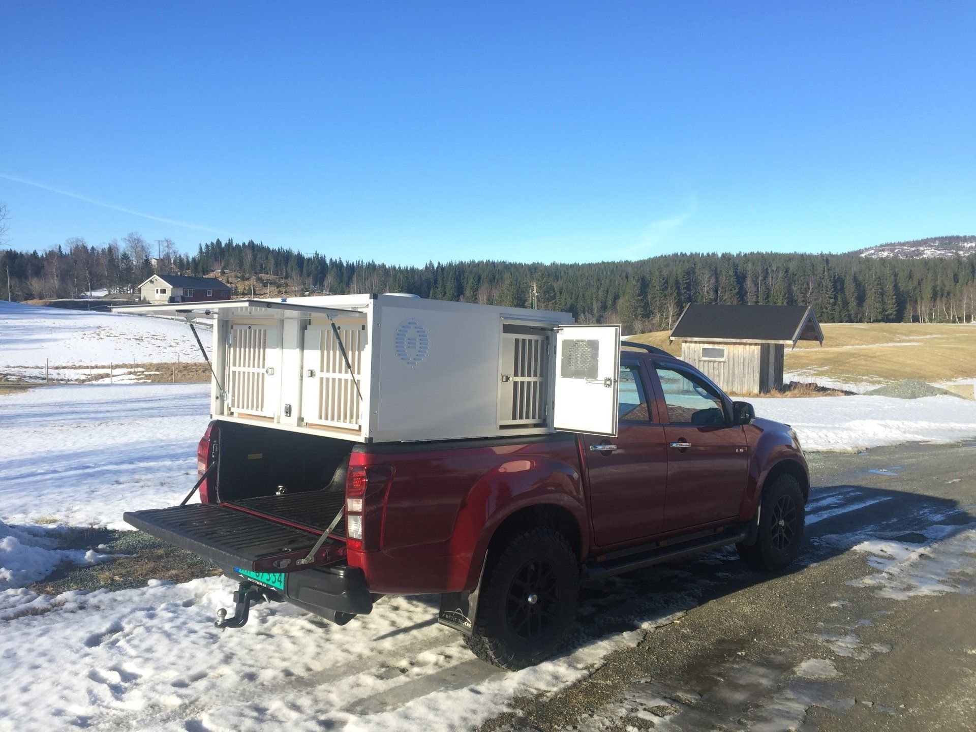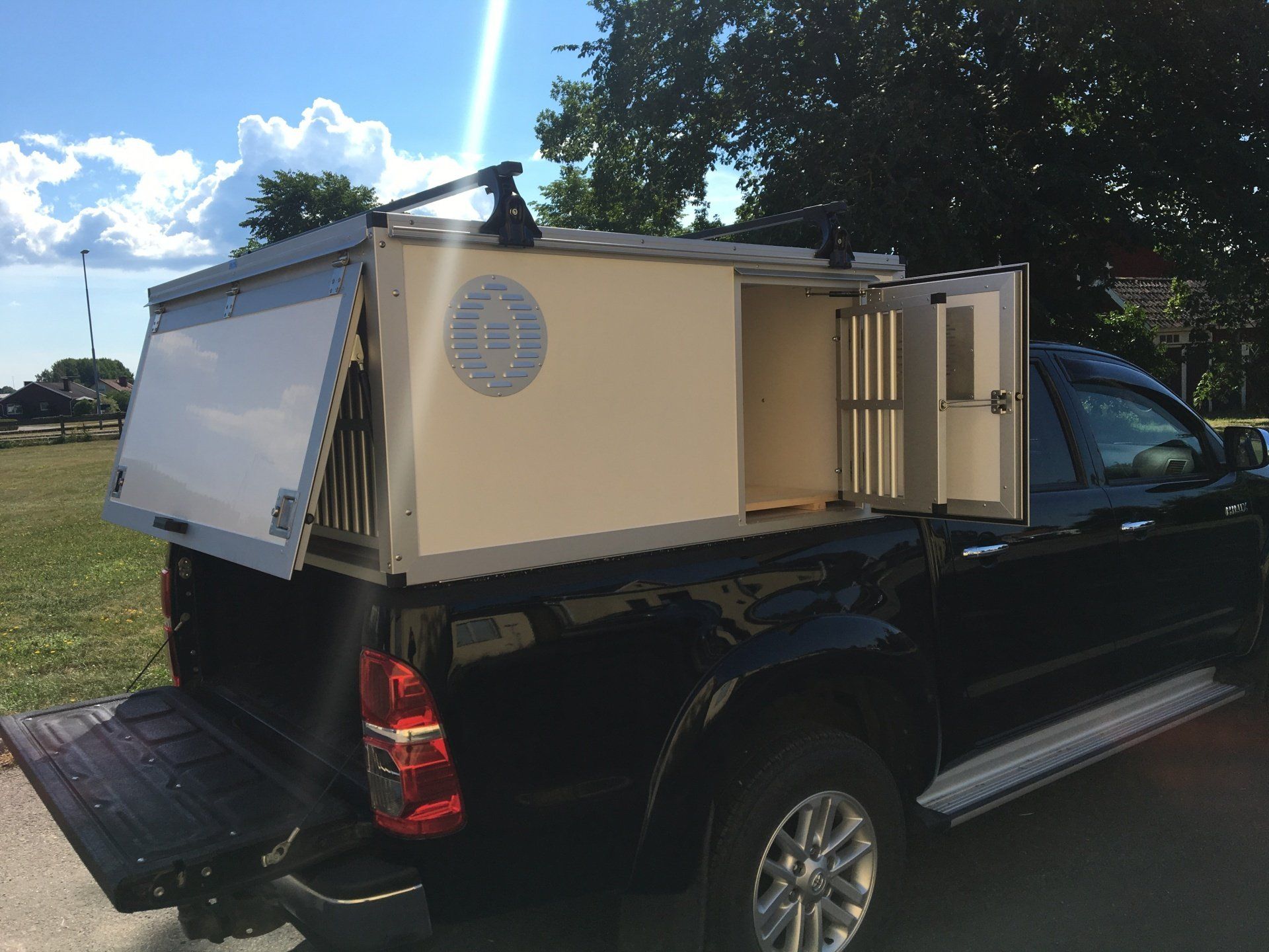 I boxarna har vi i grundpriset gummimattor (bygger ca 1 cm) och som tillval finns trätrall (bygger ca 4 cm). Alla ytterdörrar har gasdämpare så att de hålls på plats och för hundarna har vi även dörruppställare så att man kan få ett bra självdrag utan att få in solljuset när man står parkerad. Våra luftintag sitter på sidan för att slippa baksuget från bilen vid färd på dammiga grusvägar. I priset ingår även vapenfack komfort.