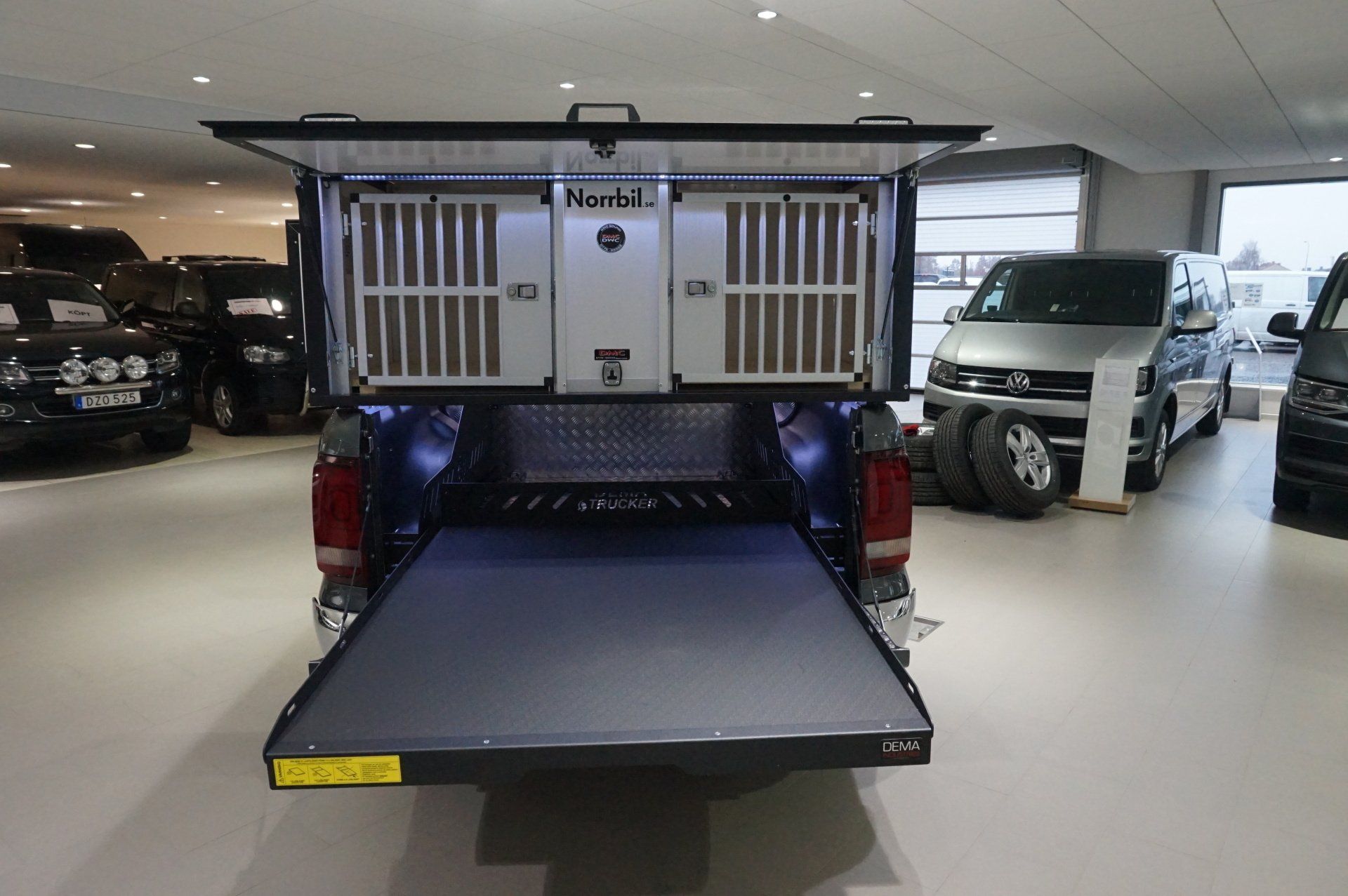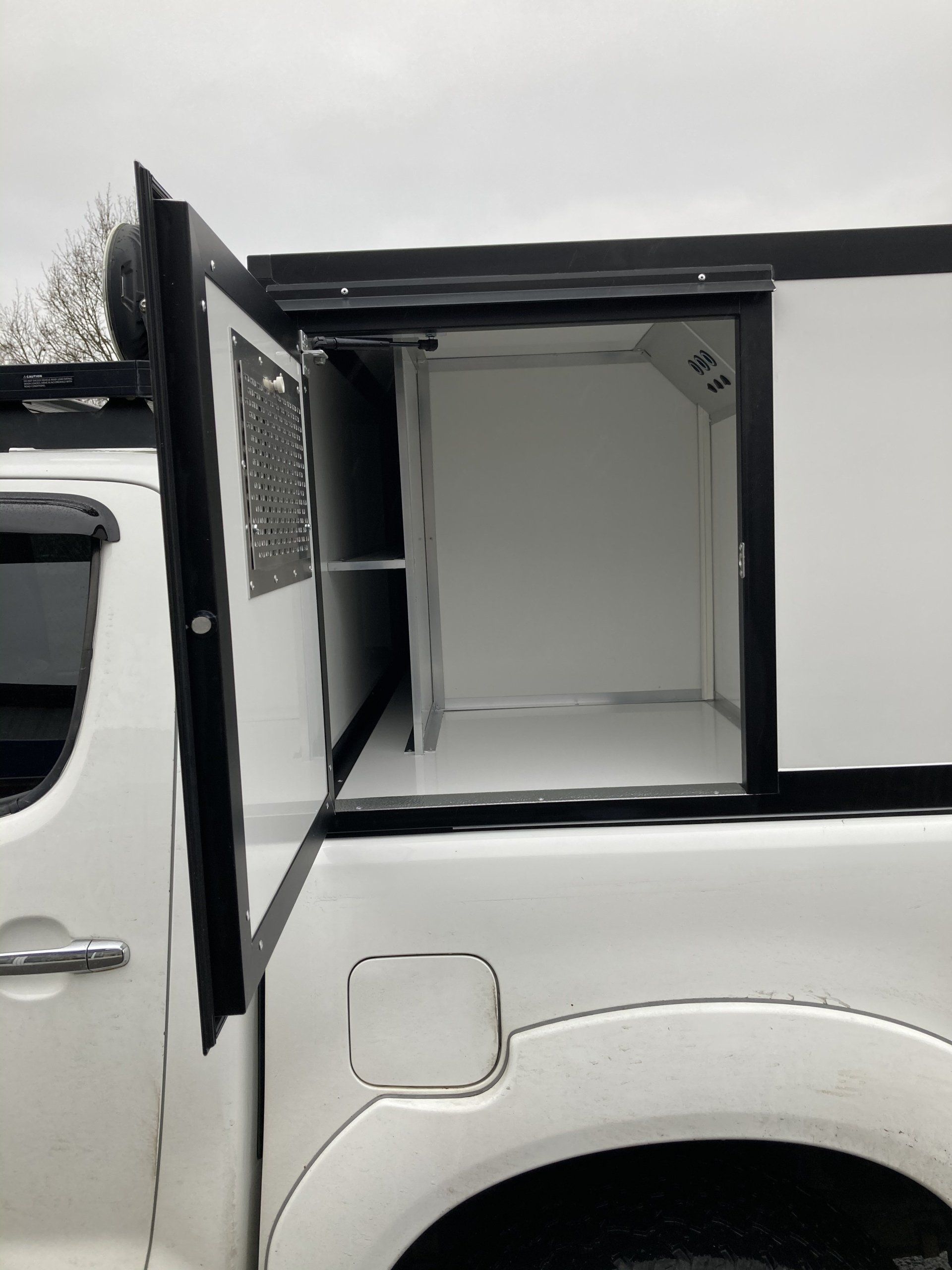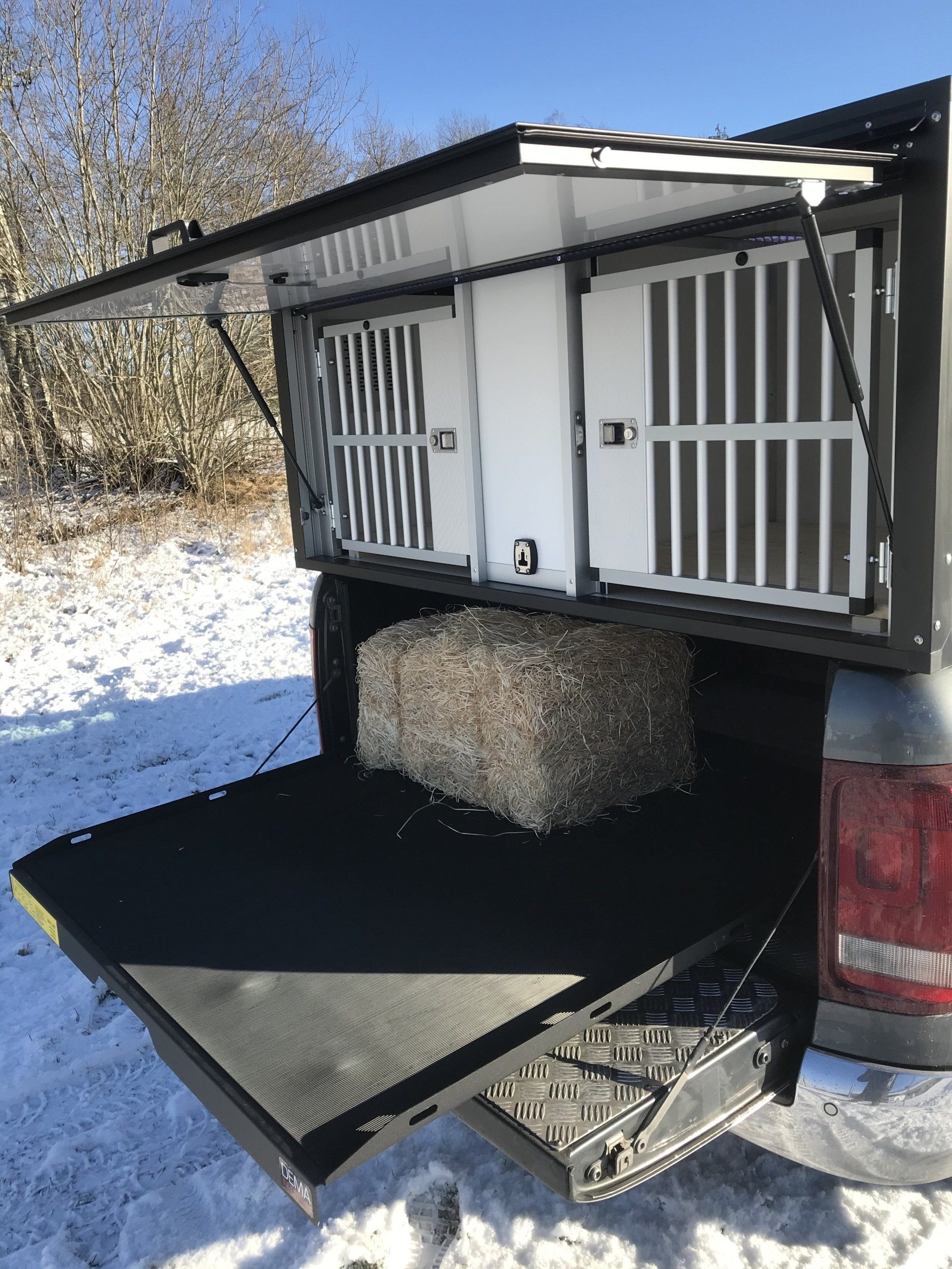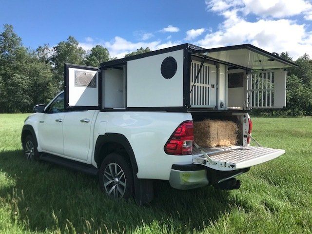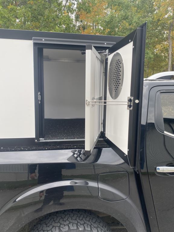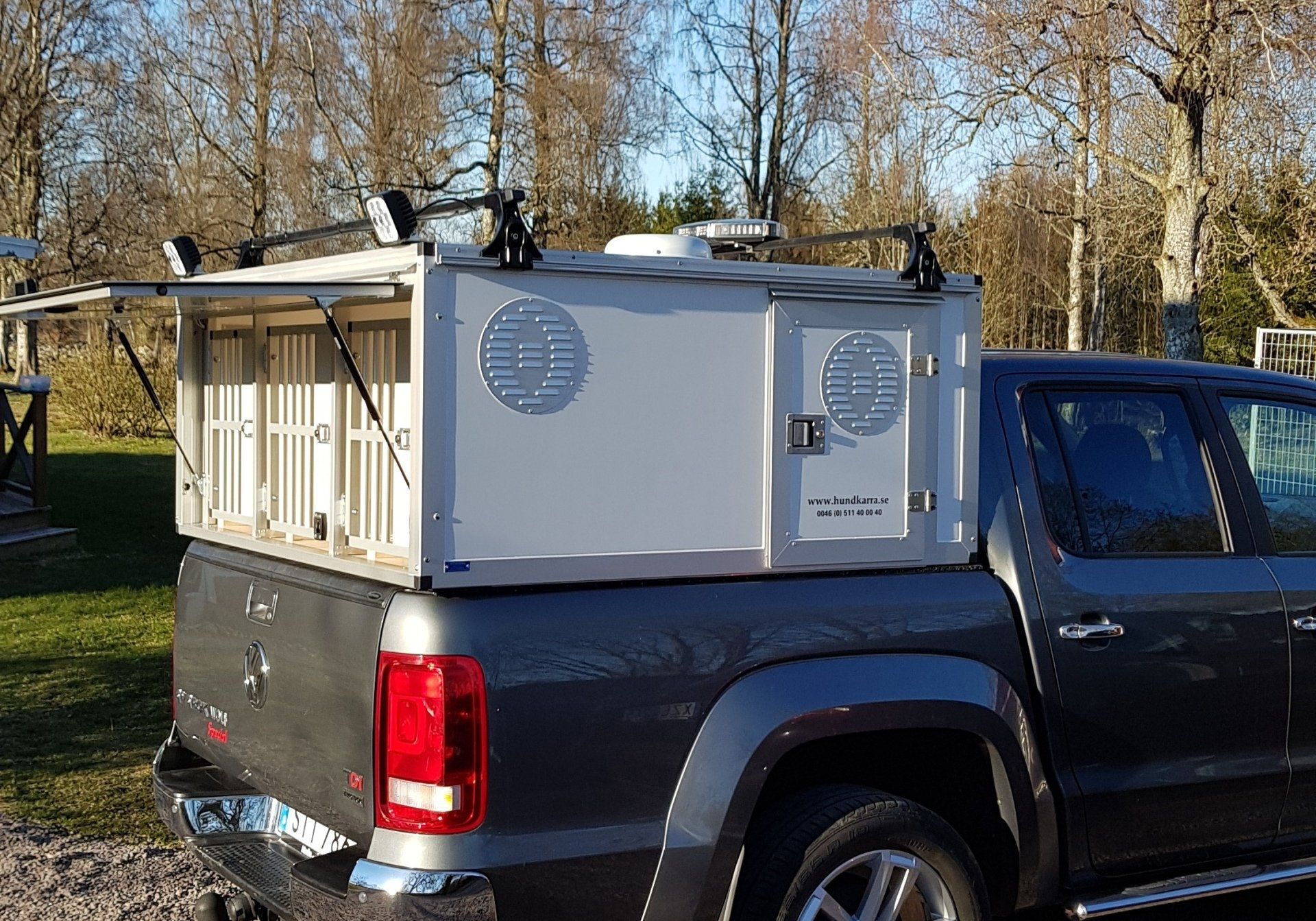 I boxarna har vi i grundpriset gummimattor (bygger ca 1 cm) och som tillval finns trätrall (bygger ca 4 cm). Alla ytterdörrar har gasdämpare så att de hålls på plats och för hundarna har vi även dörruppställare så att man kan få ett bra självdrag utan att få in solljuset när man står parkerad. Våra luftintag sitter på sidan för att slippa baksuget från bilen vid färd på dammiga grusvägar. I priset ingår även vapenfack komfort.