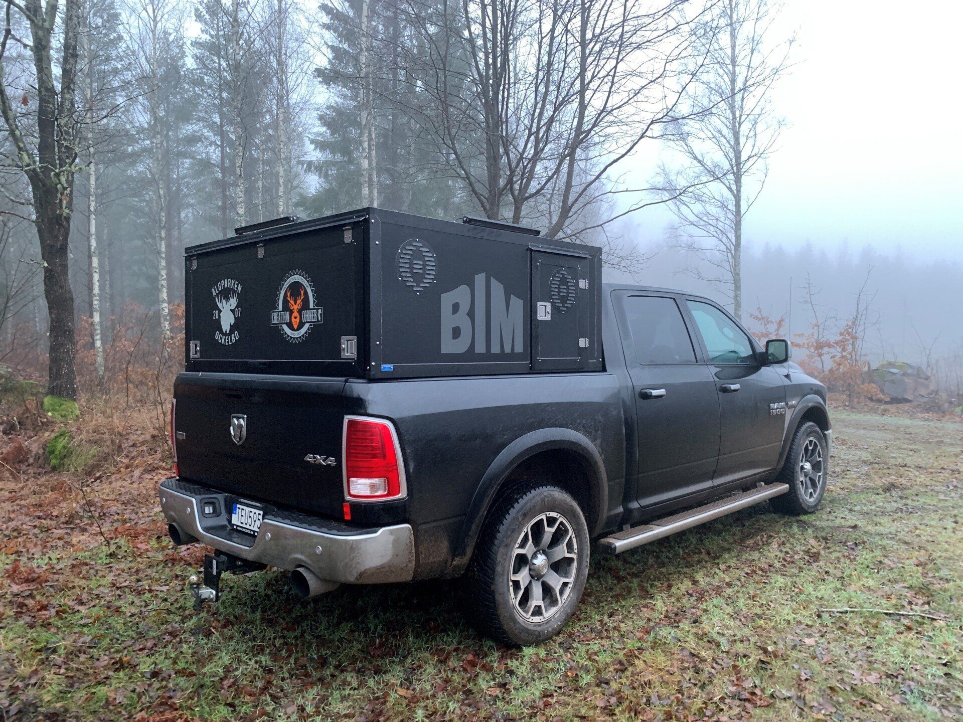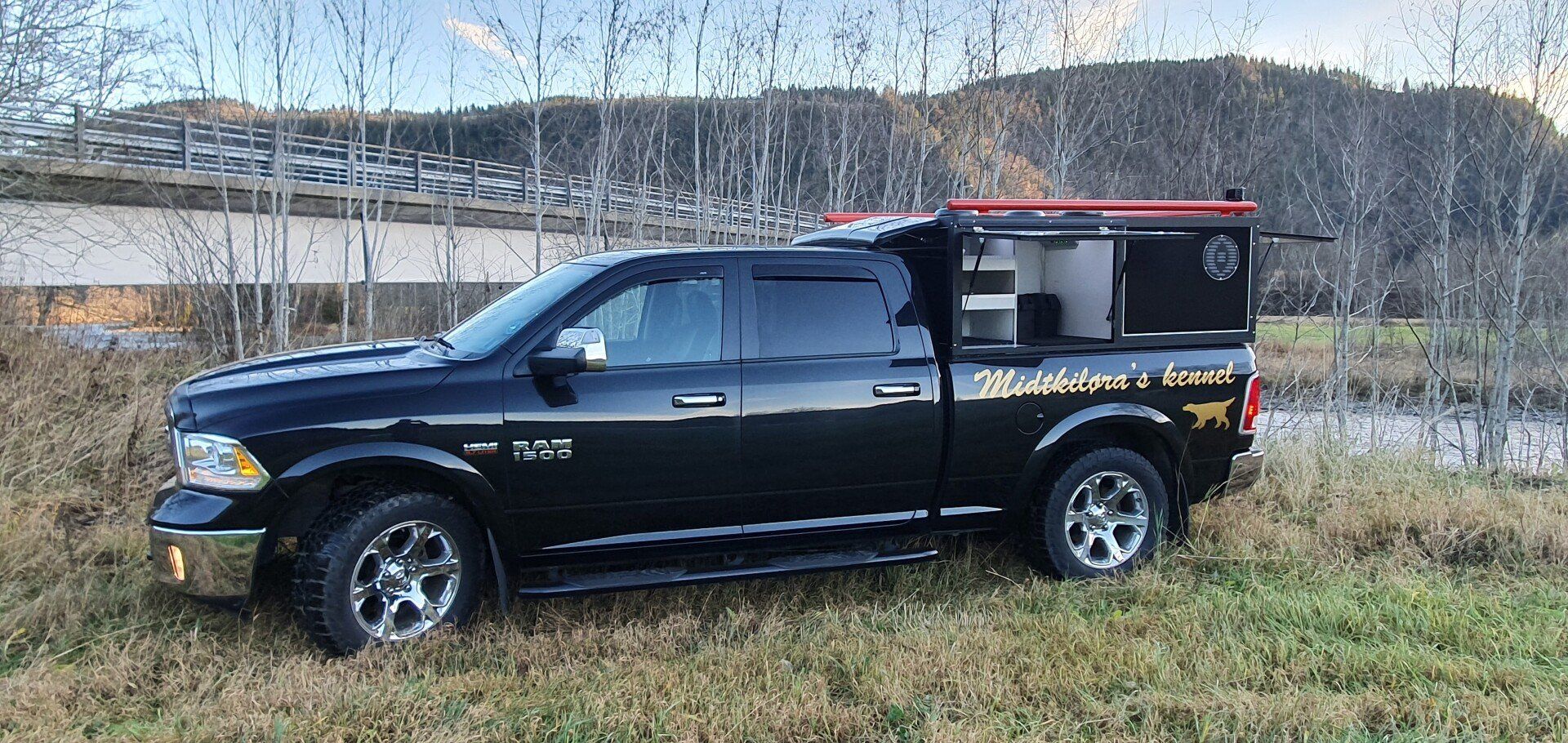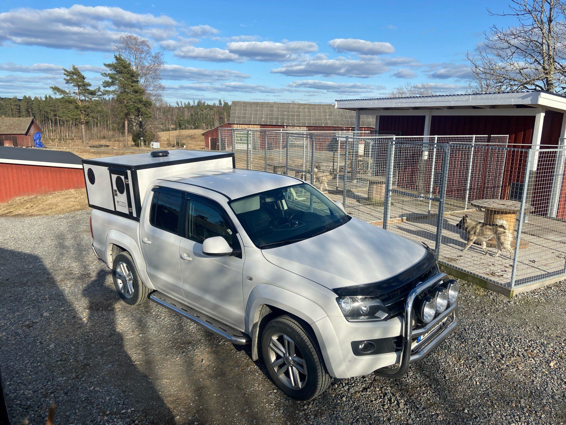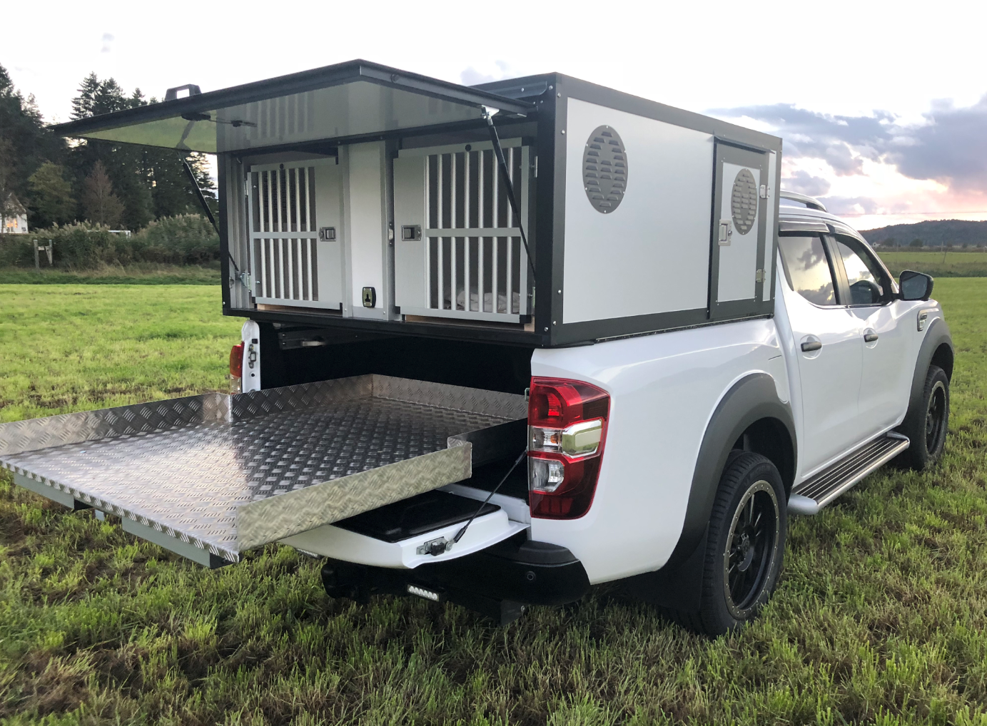 I boxarna har vi i grundpriset gummimattor (bygger ca 1 cm) och som tillval finns trätrall (bygger ca 4 cm). Alla ytterdörrar har gasdämpare så att de hålls på plats och för hundarna har vi även dörruppställare så att man kan få ett bra självdrag utan att få in solljuset när man står parkerad. Våra luftintag sitter på sidan för att slippa baksuget från bilen vid färd på dammiga grusvägar. I priset ingår även vapenfack komfort.