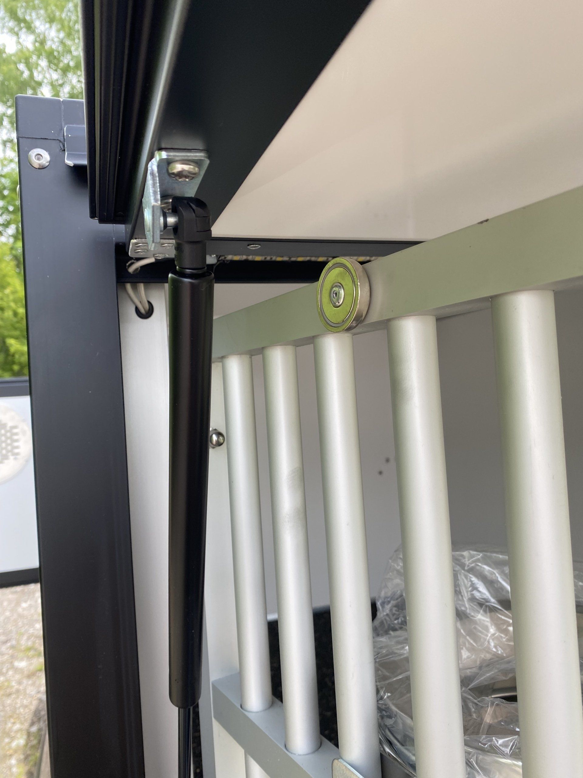 Alla våra hundboxar är utrustade med en kraftig elektrisk fläkt på taket med inbyggd LED-belysning för boxarna. Fläkten sitter skyddat ovanpå taket i en superventil så att inget sticker ner som kan skada era hundar. Luftintagen sitter högt placerade för bästa klimat för era hundar samt för bästa lufttillförsel. Våra förstärka innergrindar är stabila, sitter hårt på plats och är lätta att justera över tid. Grindarna är självklart låsbara med nyckel likt våra isolerade ytterdörrar. Det är samma nyckel till modulen men olika nyckelserier så att man inte kommer in med annan nyckel. Alla moduler som byggs 2023 och framåt har även magneter på innergrindarna som sitter vid en gasdämpare för enkel uppställning.