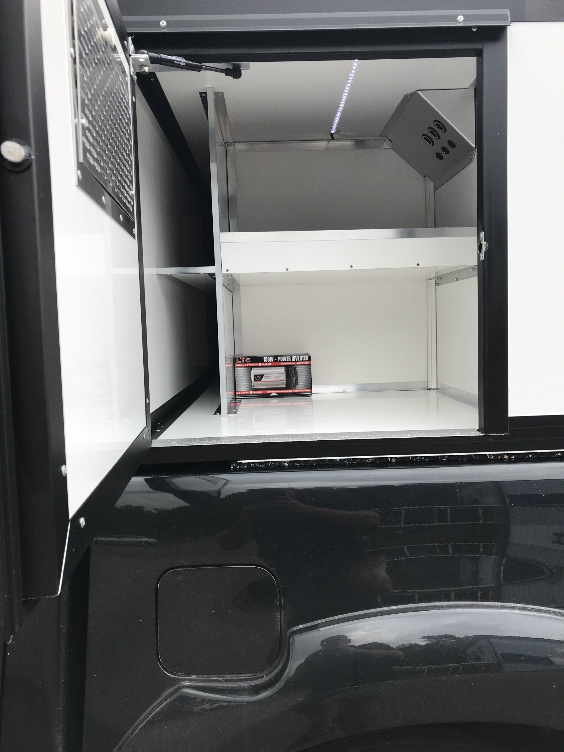 I vårt vapenpaket 3+1 Large ingår det även en hylla i vapenfacket, led belysning i vapenfacket samt en lös konverterare till 12 volt. De flesta kunder väljer att senare köpa till dessa saker, eller det man önskar, löst och montera in det själva så att man får det precis som man själv vill ha det. Detta går att beställa via vår webbshop!