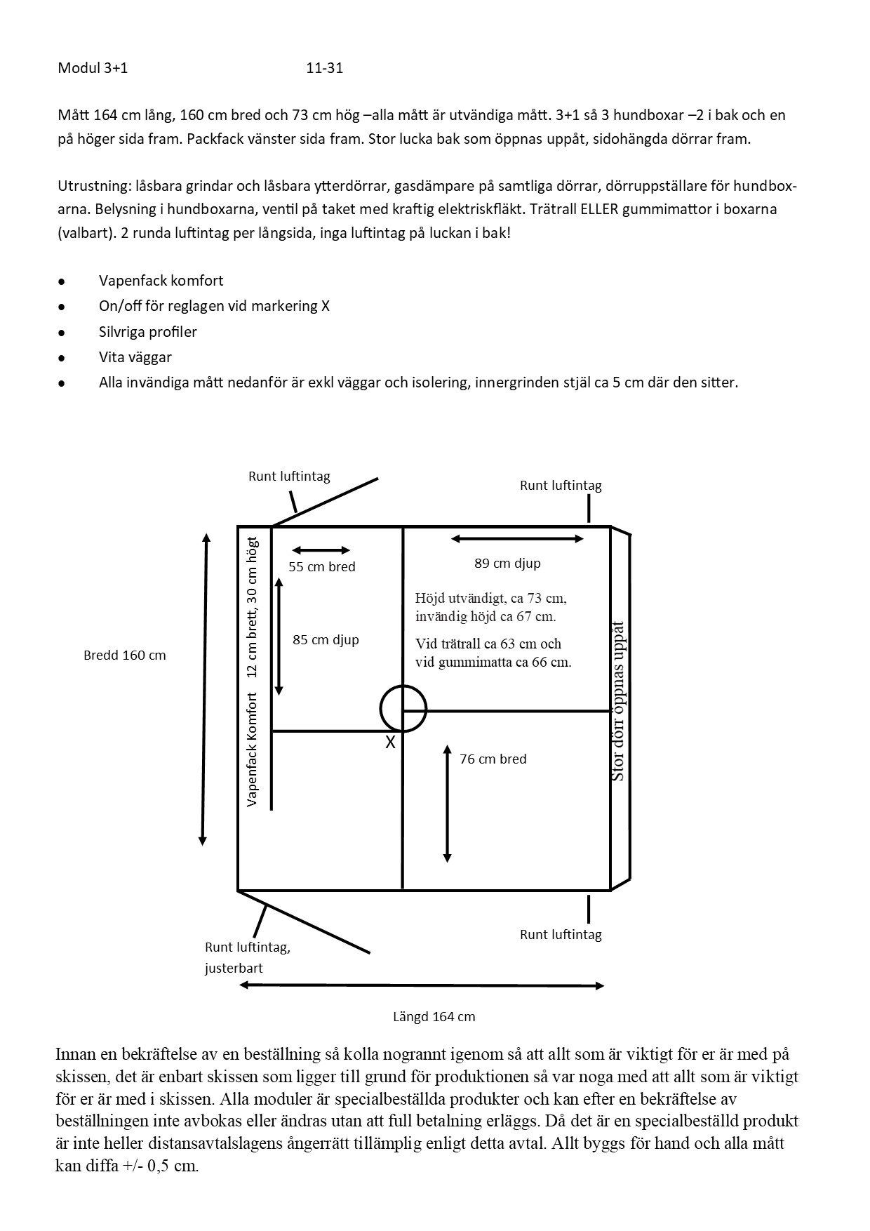 Vi bygger som du vill! Men 73 cm är en bra höjd för de flesta jakthundar samtidigt som det inte ger stort vindfång. Gör man boxen högre än 73 cm kan man få vinden fel genom ett kallras. Detta då vinden går ner via superventilen. Detta löser man enkelt genom en spoiler på taket som leder bort luften. Av flera tusen sålda moduler med högre mått har 3 kunder haft detta problemet. Men bara så att man tänker på det hela.