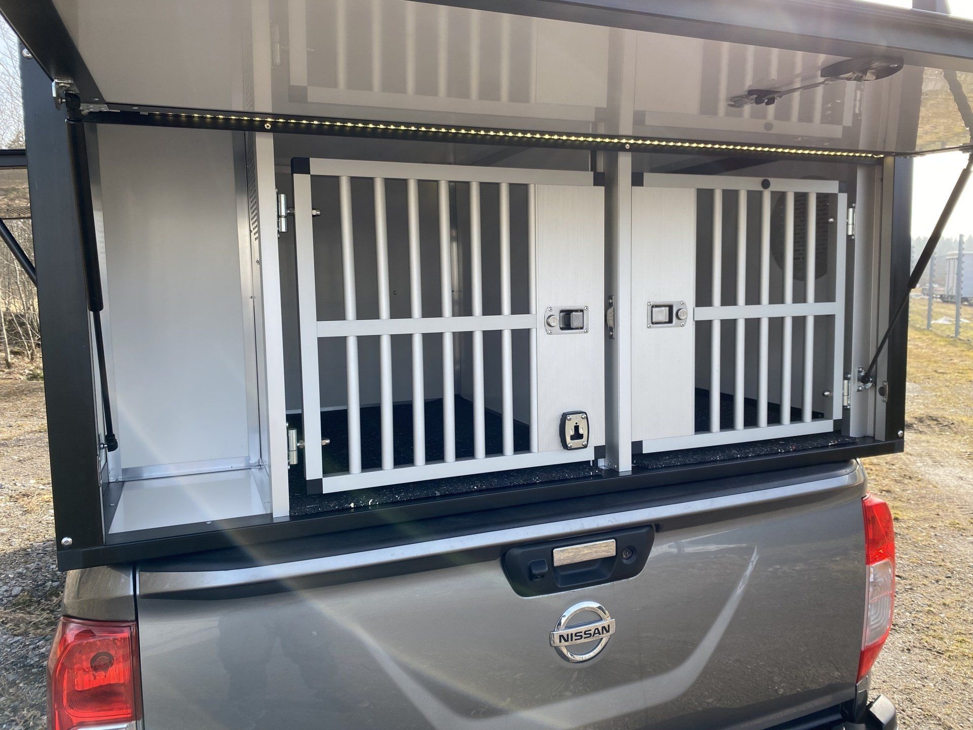 Genom LED Paketet 3+1 får man 2 LED slingor under modulen som lyser upp på själva flaket samt vid stora luckan i bak. Därmed ser man sina saker på flaket och får även ett väldigt bra ljus vid stora luckan om man skall ta på sina hundar koppel, gps, skyddsvästar.