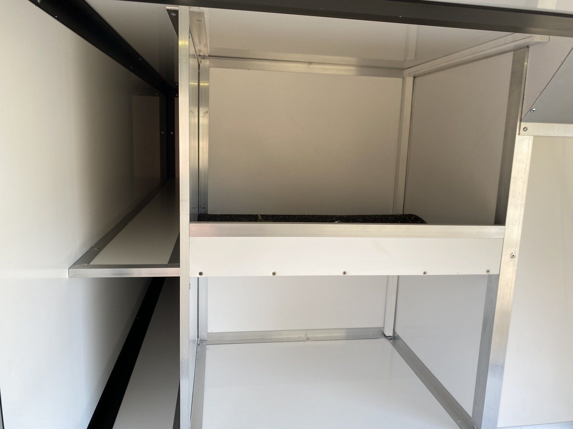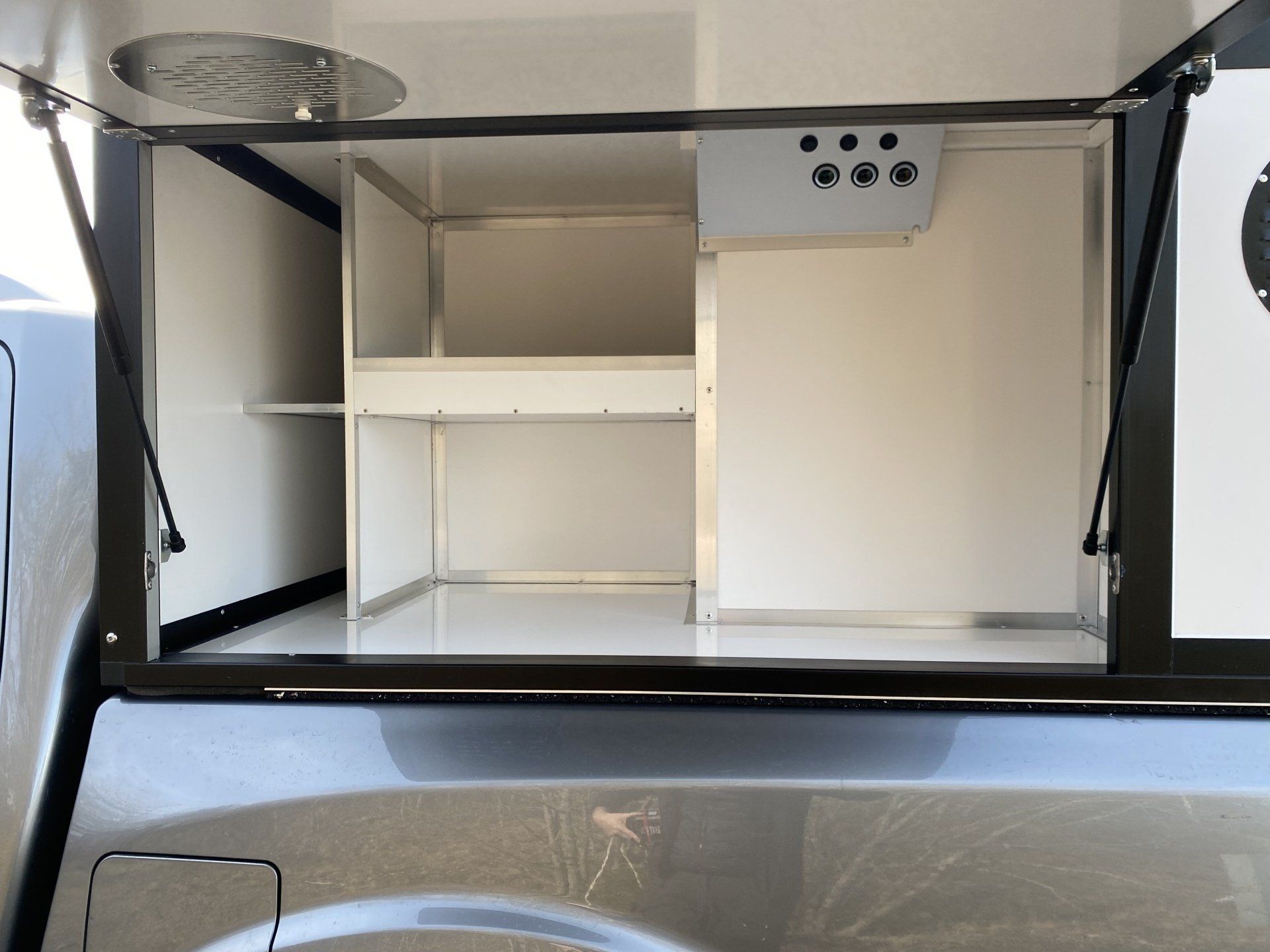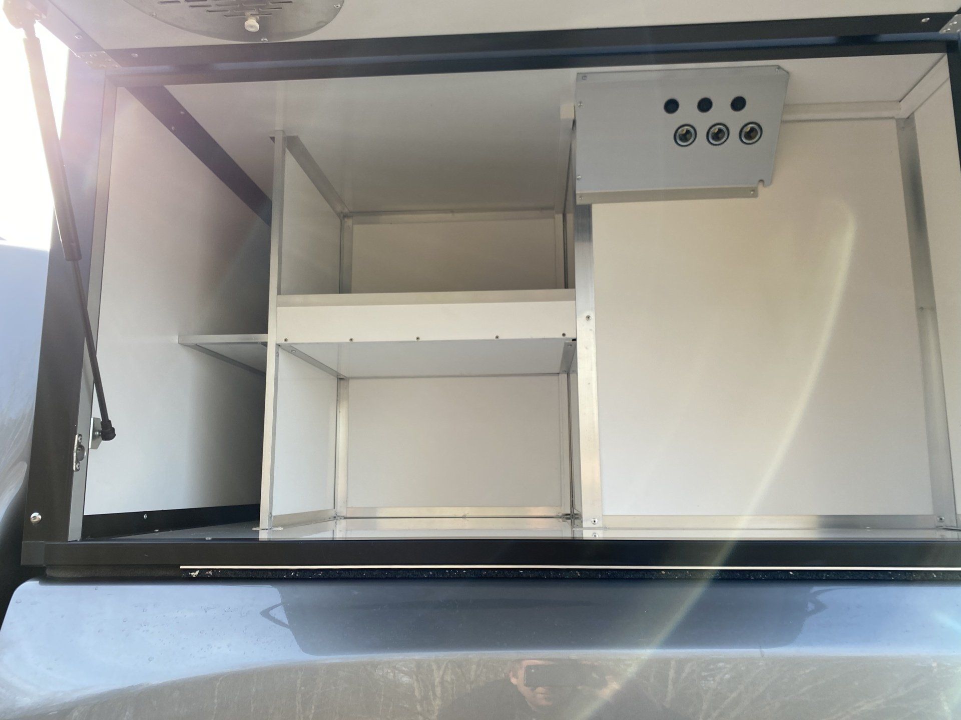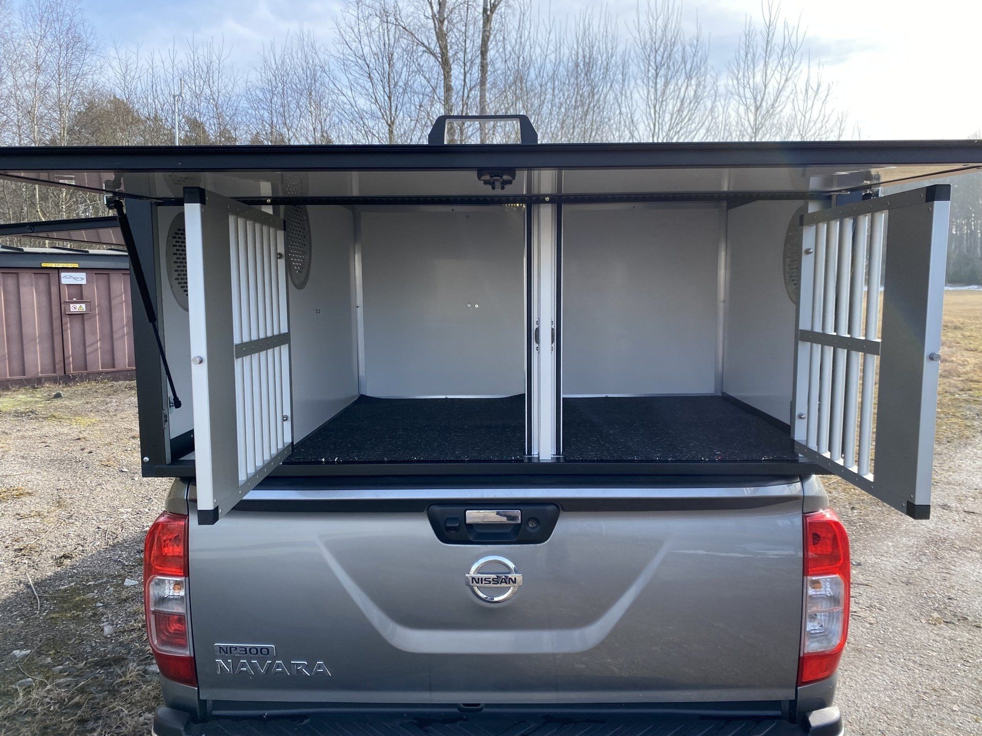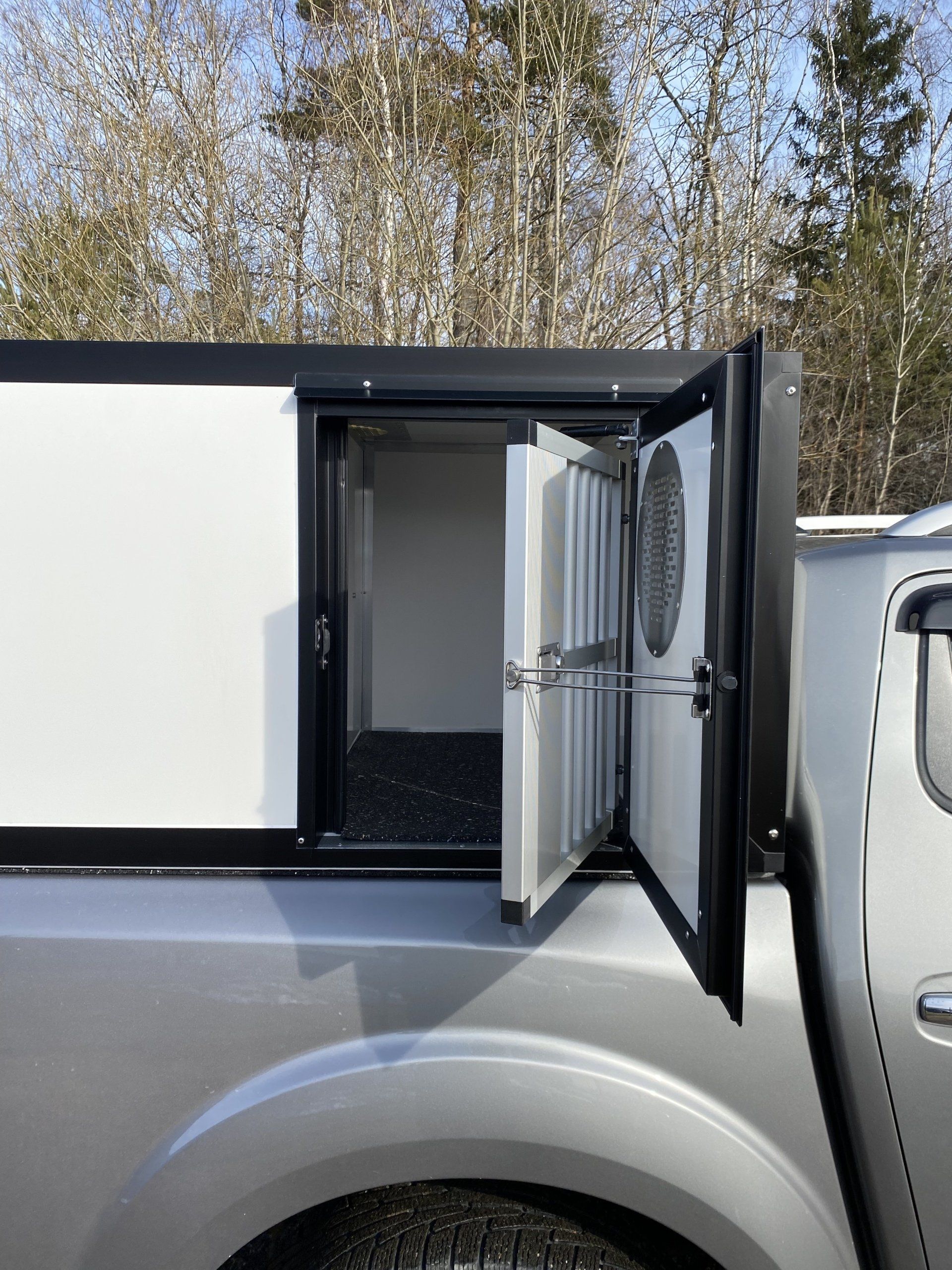 I boxarna har vi i grundpriset gummimattor (bygger ca 1 cm) och som tillval finns trätrall (bygger ca 4 cm). Alla ytterdörrar har gasdämpare så att de hålls på plats och för hundarna har vi även dörruppställare så att man kan få ett bra självdrag utan att få in solljuset när man står parkerad. Våra luftintag sitter på sidan för att slippa baksuget från bilen vid färd på dammiga grusvägar.