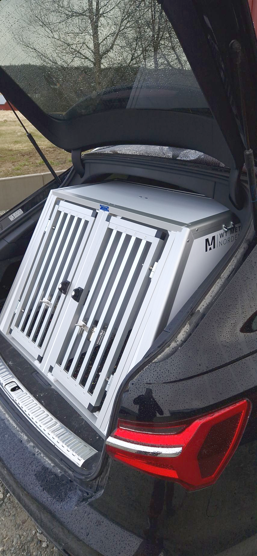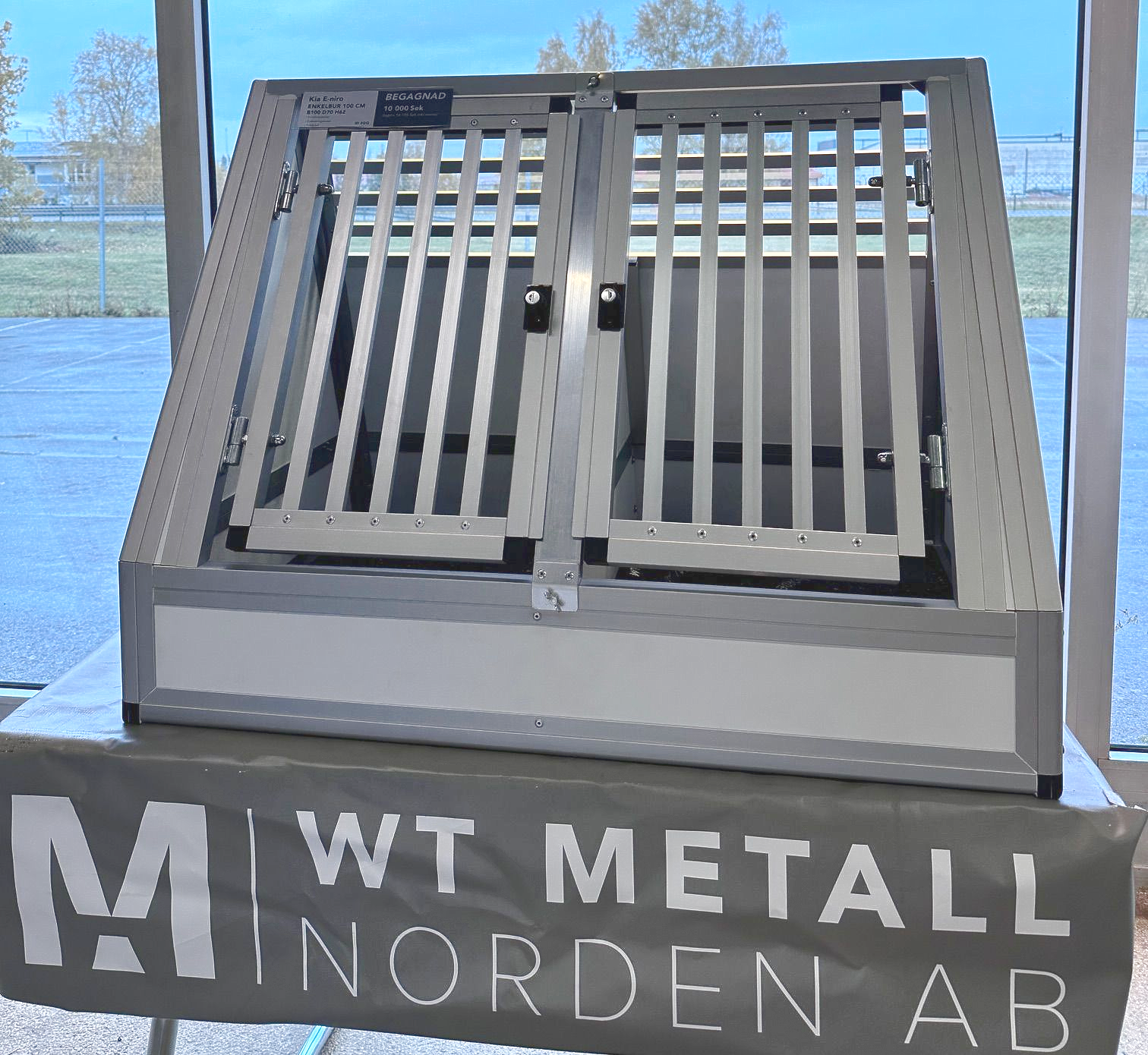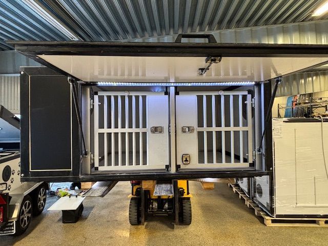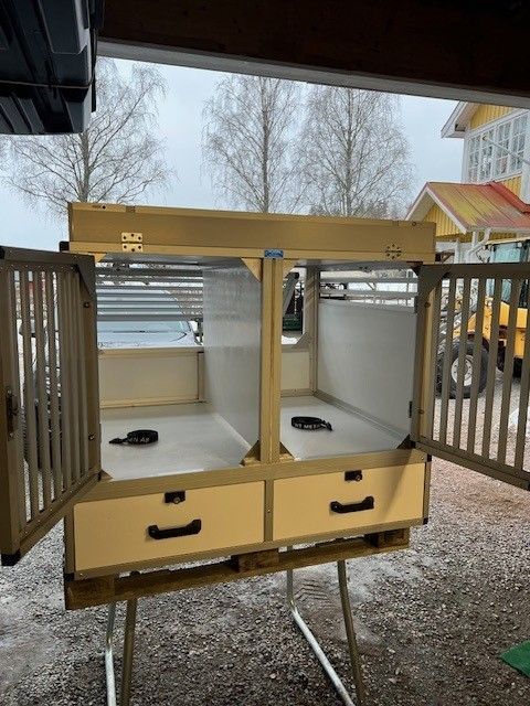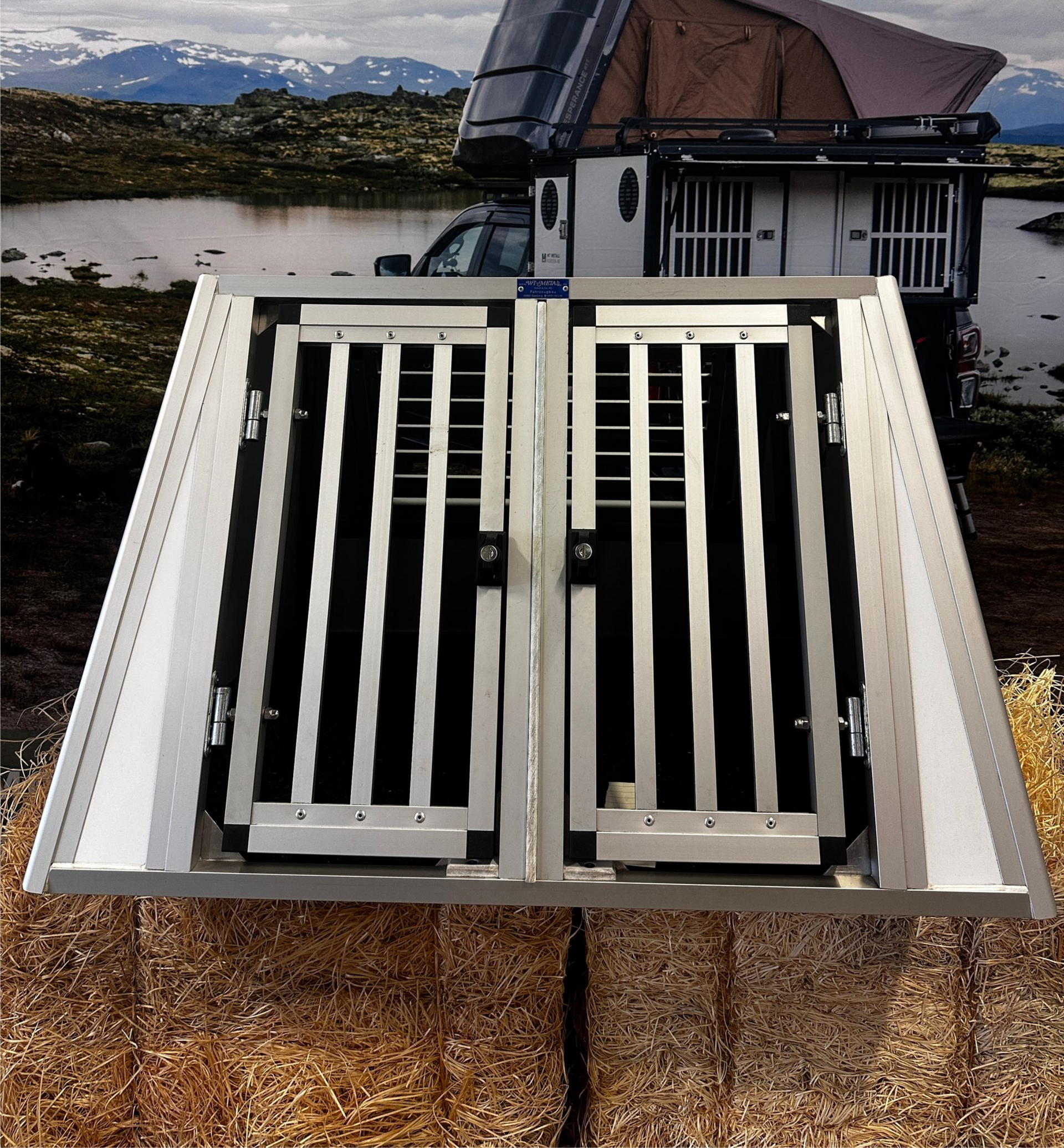 En dubbelbur byggd till Kia E-niro. Denna bur är tvådelad för att maximera höjden. Utrustad med evakueringslucka