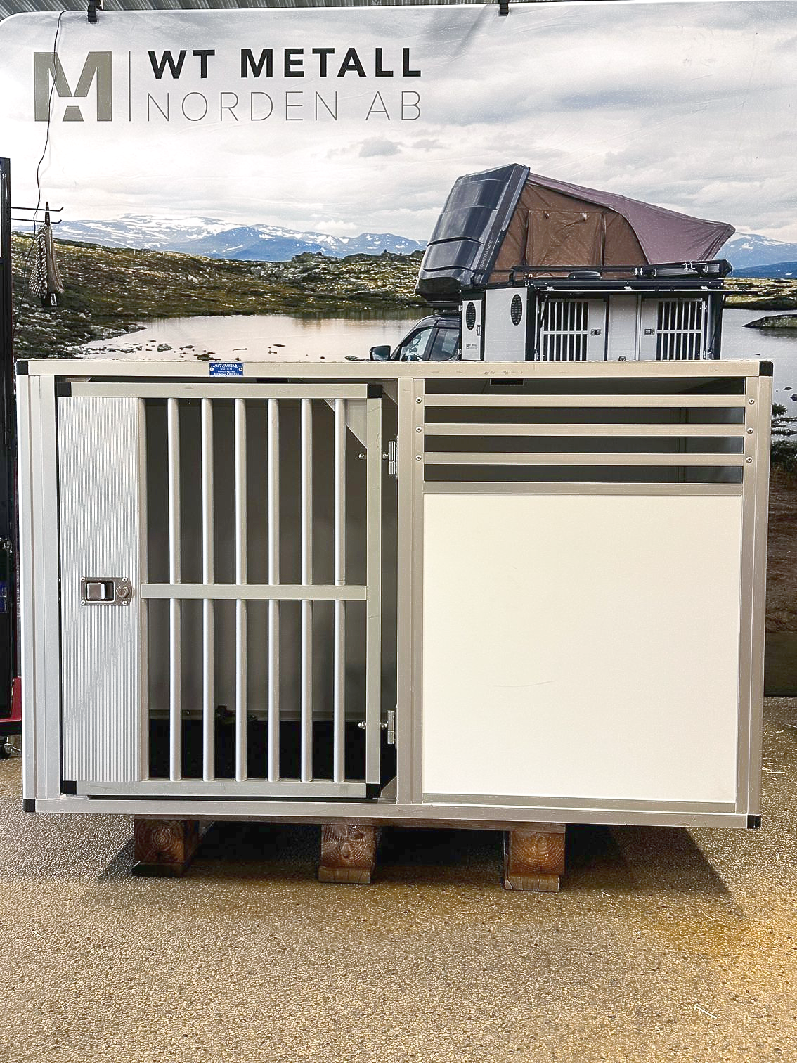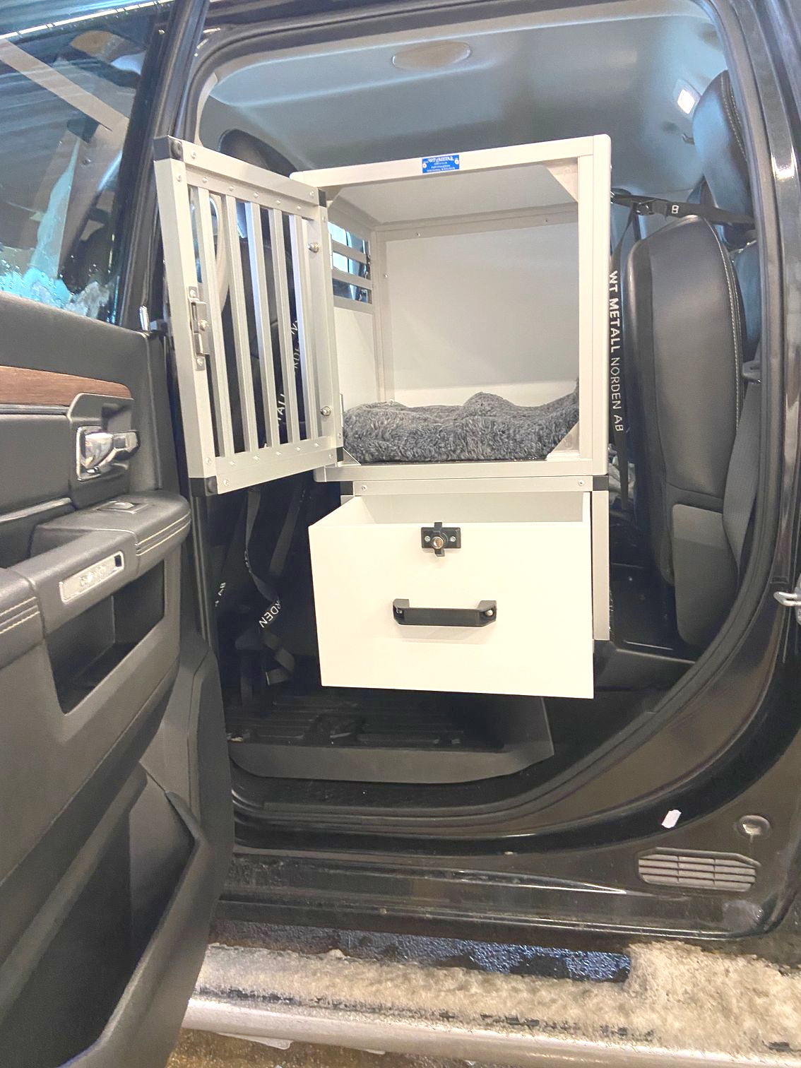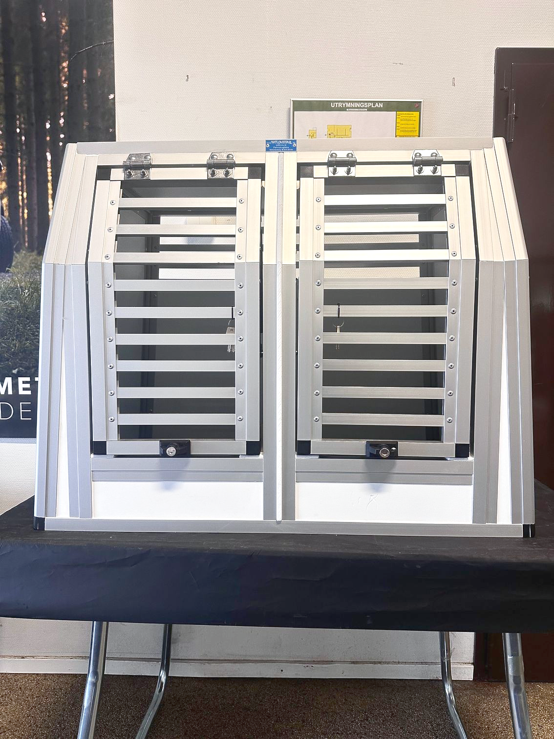 En dubbelbur byggd till Kia E-niro. Denna bur är tvådelad för att maximera höjden. Utrustad med evakueringslucka