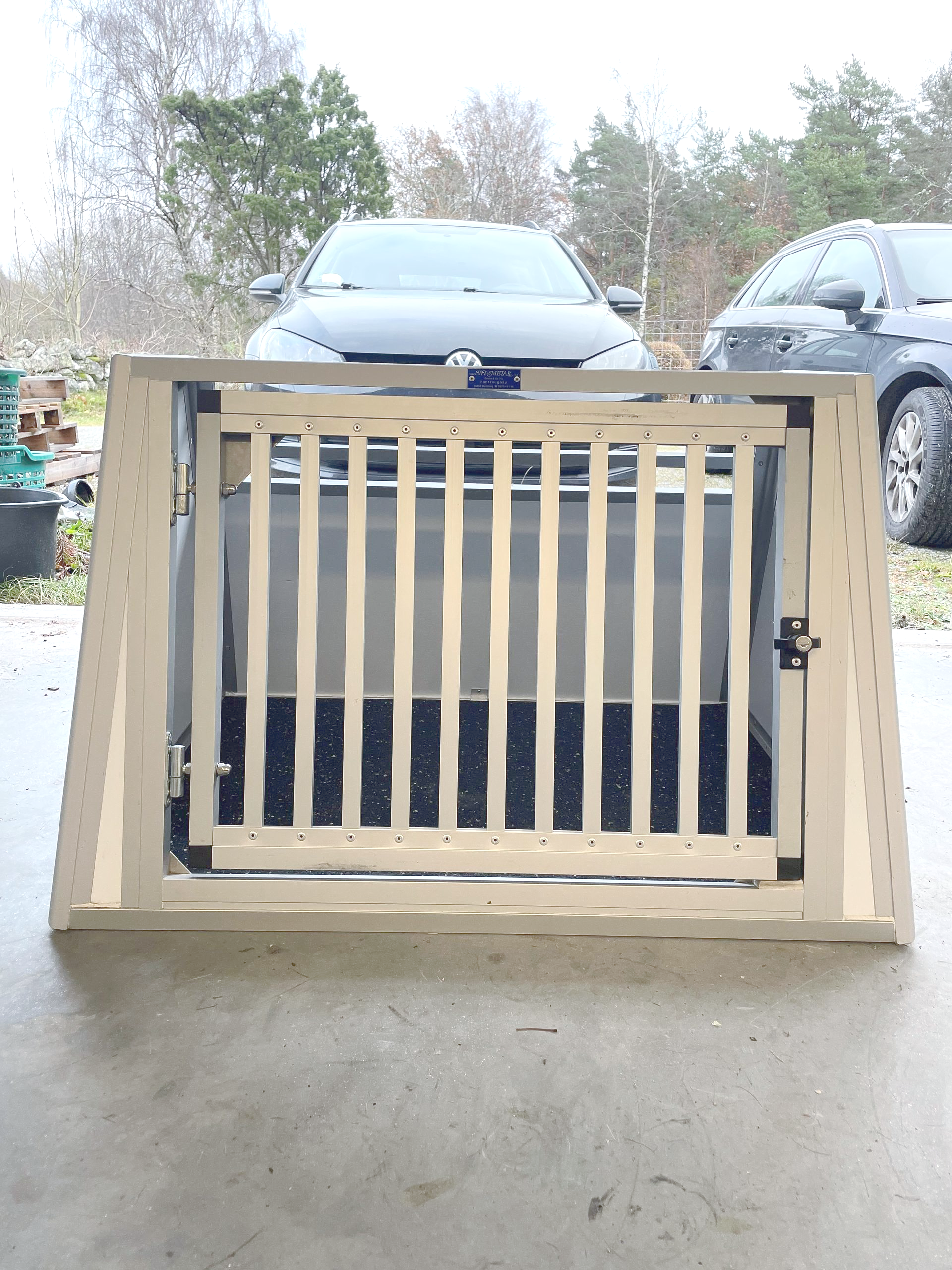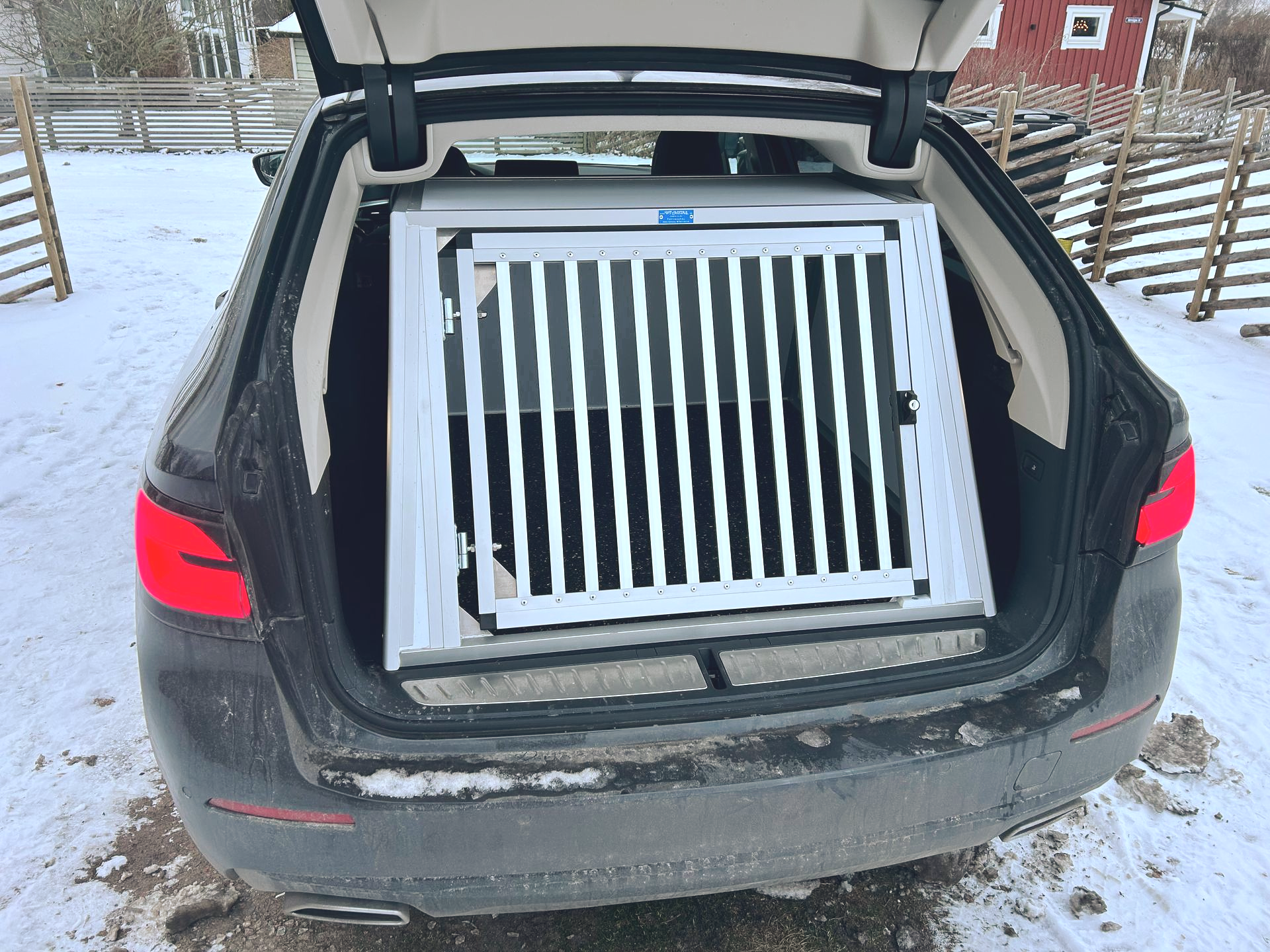 En sparsamt använd enkelbur i fint skick. Byggd till en BMW 520 men passar även andra modeller. Denna bur byggdes 2025.
