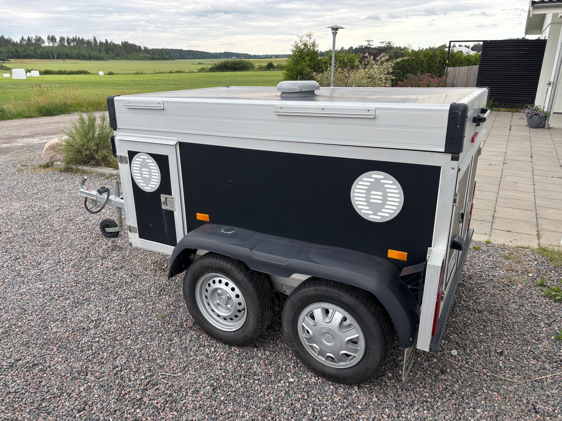 Extra utrustad med svarta profiler, temperaturregulator till fläkt, ledbelysning i taklådan. Boxarna är 117 cm långa 60 breda.