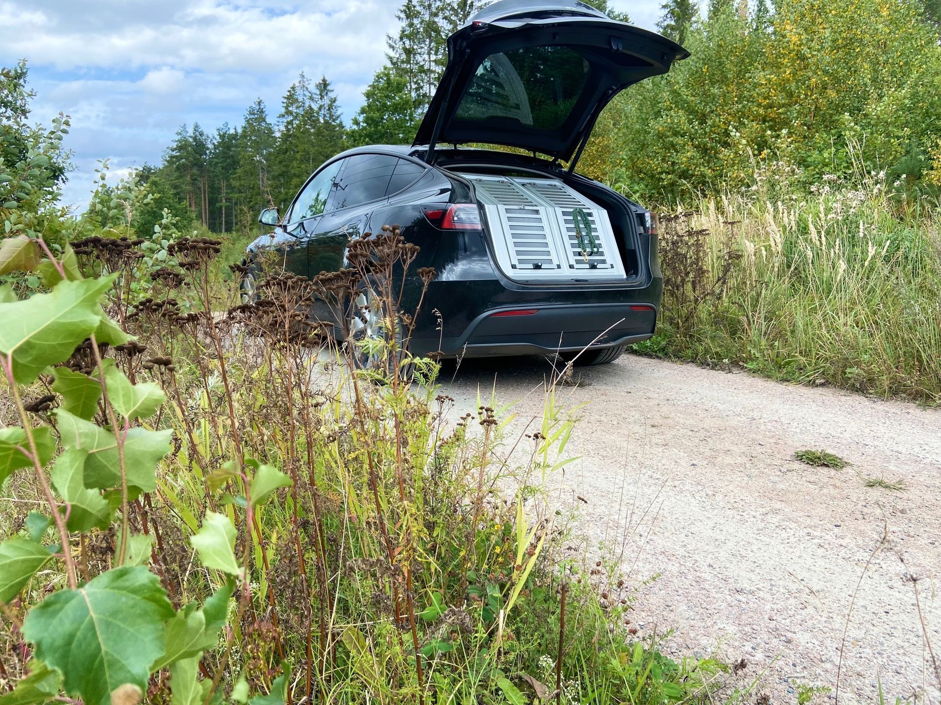 Enkelbur till Porsche Taycan Cross Turismo. Buren är maxad på höjden och därför byggd i två delar!